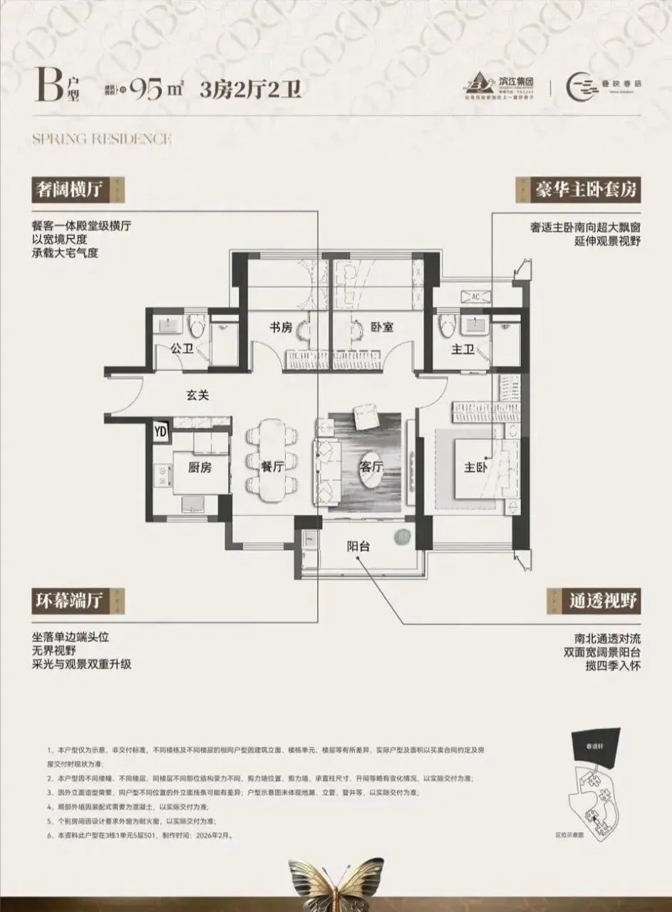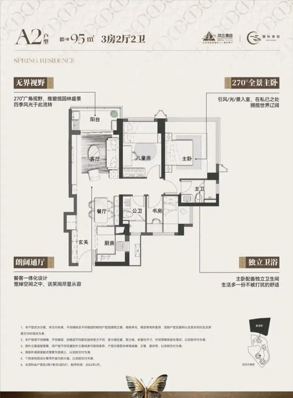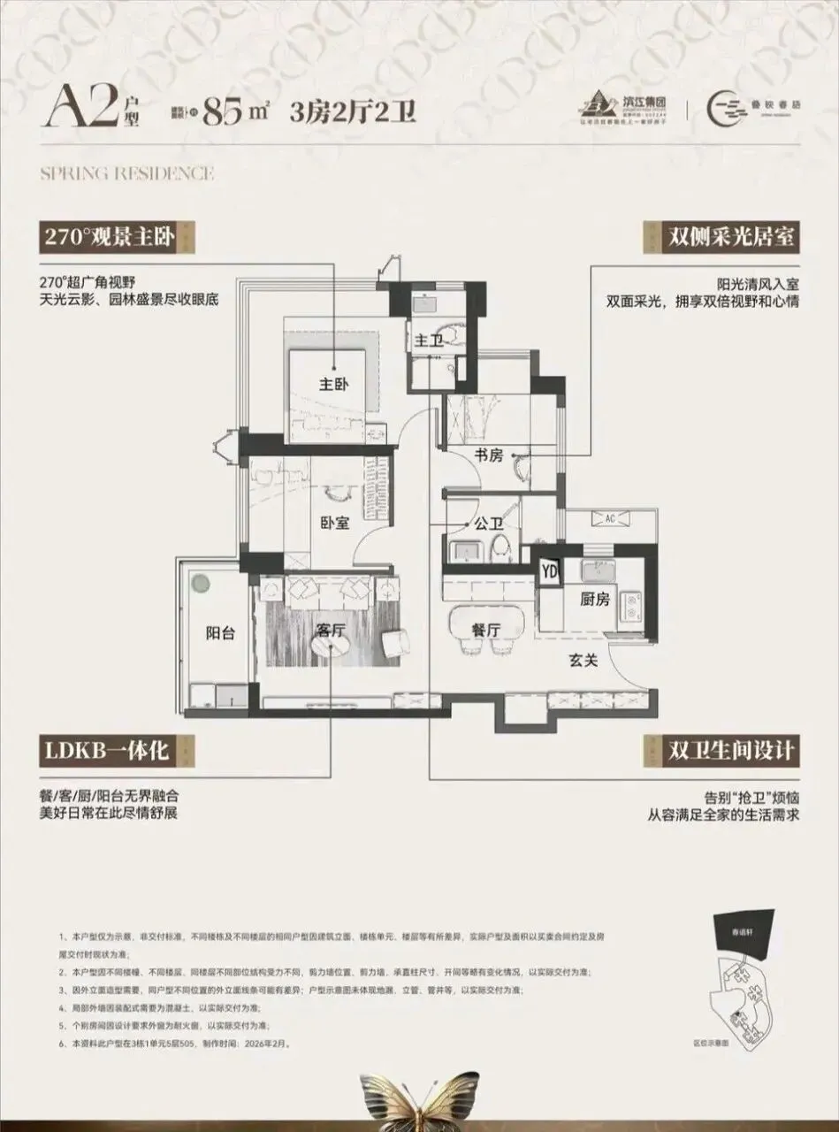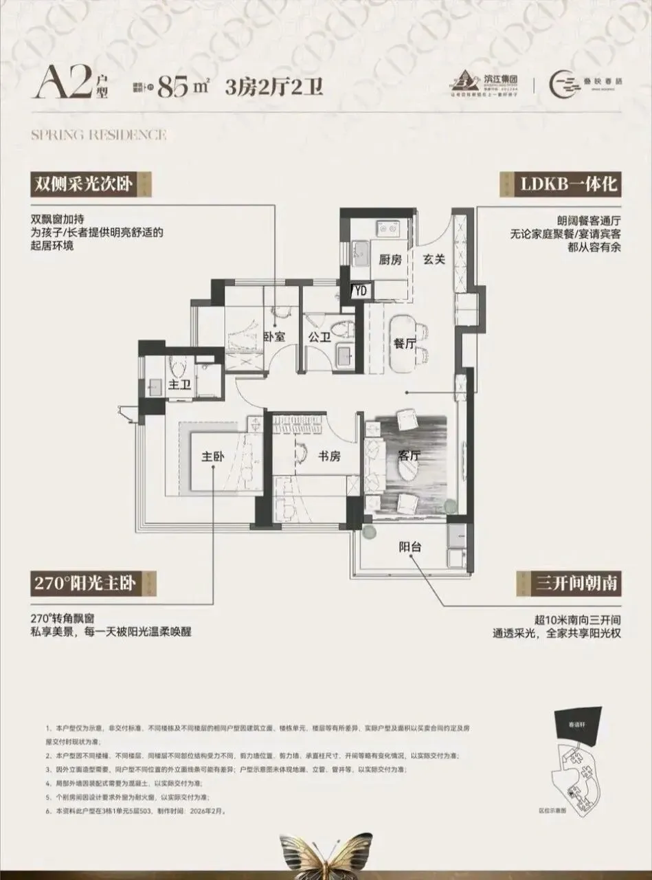 滨江·叠映春语项目由滨江集团打造,总占地面积约3.45万㎡,总建筑面积约30.48㎡,计容建筑面积约21.45万㎡,容积率5.76,绿化率40.01%。项目分叠映轩+春语轩2个地块打造,共由6栋总高43-50层的住宅组成,地块之间有连廊相接,总共规划2005户,其中公租房420套,可售商品房有700多套,其它都是回迁房,规划车位2369个,车位配比约1:1.18。