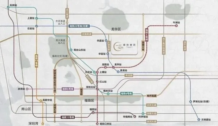 滨江·叠映春语构建起“地铁+快速路+公交+城际”的多维立体交通网络,出行便捷度覆盖日常通勤与跨区出行全场景。轨道交通方面,项目直线距离约480米处为地铁25号线华富站(建设中),未来开通后可无缝换乘4、6、22号线等多条线路,快速通达福田、南山、宝安等核心区域;直线3公里范围内覆盖地铁4号线元芬站、6号线阳台山东站,通过公交接驳可快速换乘,满足当下轨道交通出行需求。自驾出行上,项目紧邻城市快速路龙澜大道,向北衔接机荷高速、外环高速,向南经福龙路直达福田中心区,车程约40分钟,还可快速接驳龙大高速、南光高速,贯通深圳东西南北;同时临近深圳北站枢纽,未来深大城际(建设中)也将进一步提升跨区与城际出行效率。公共交通层面,项目1公里内设有浪口村、河背工业区、墩背居委会等25个公交站点,最近的浪口村站仅约146米,多条公交线路覆盖大浪、龙华、福田等片区,日常短途出行与地铁接驳均十分便利。