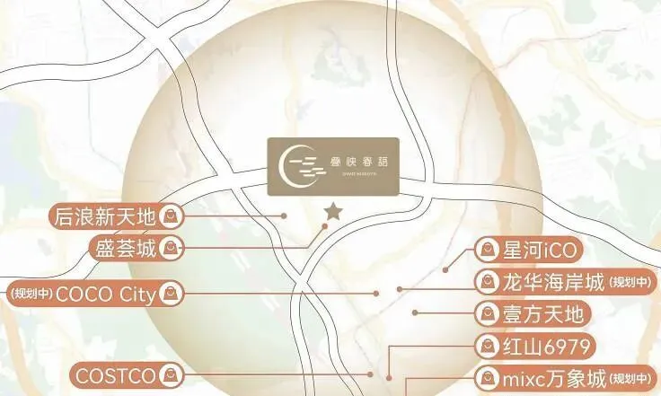 滨江·叠映春语商业配套呈现“社区底商+片区商圈+市级商业”的三级覆盖,日常消费、休闲娱乐、品质购物一站式满足。项目自带约2.2万㎡社区商业,规划有生鲜超市、便利店、餐饮、药店、母婴店等多元业态,下楼即可解决柴米油盐等基础生活需求,打造10分钟便捷生活圈。片区级商圈方面,直线约850米即是盛荟城(约85万㎡综合体),涵盖购物中心、写字楼、酒店等,还有后浪新天地近在咫尺,集潮流零售、特色餐饮、亲子娱乐、文创体验于一体,是大浪片区人气商业地标;1公里范围内还有天虹商场(龙华龙观店)、百佳华商场等成熟商超,日常购物、聚餐、休闲十分方便。市级商业层面,5公里内可直达壹方天地、红山6979等龙华核心商圈,未来还有龙华海岸城、华润万象系商业等规划落地,同时可快速通达福田CBD、龙华北站商圈等,满足高端消费、品牌购物、大型娱乐等多元需求,商业氛围浓厚且层级丰富,完全覆盖全场景消费需求。