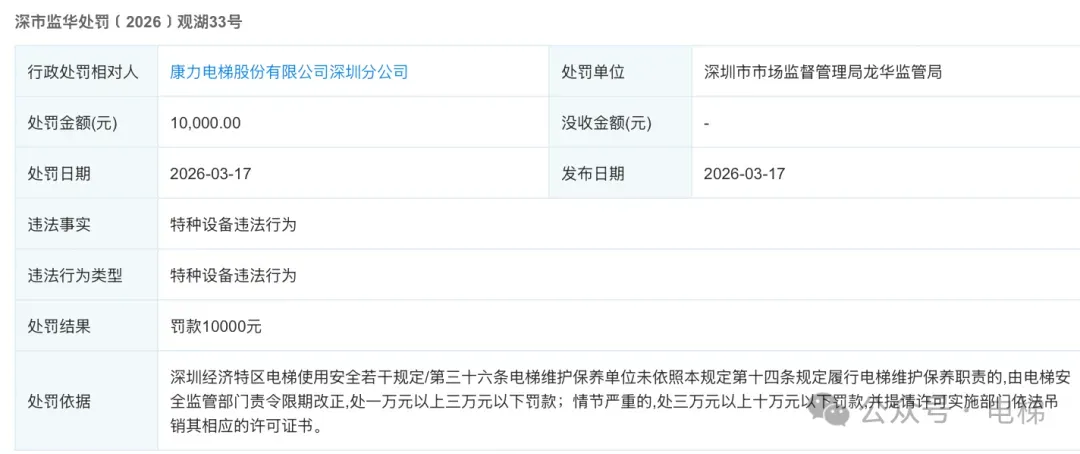 康力电梯股份有限公司深圳分公司于2026年3月17日被深圳市市场监督管理局龙华监管局罚款1万元。