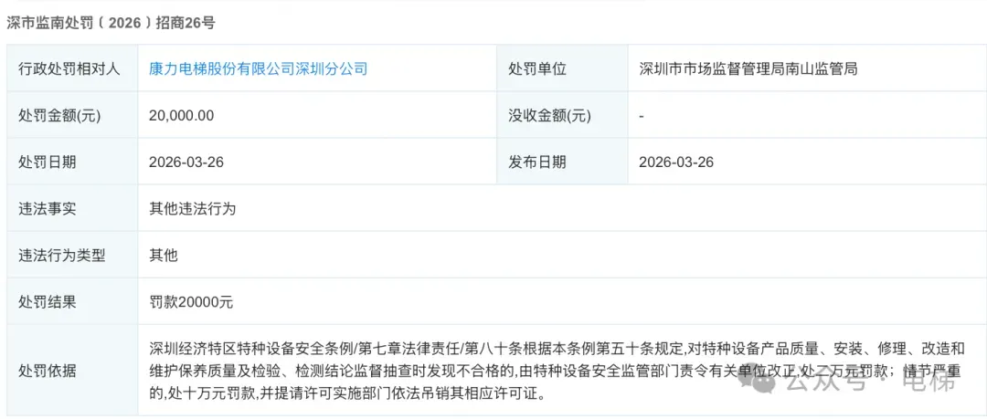 康力电梯股份有限公司深圳分公司于2026年3月26日被深圳市市场监督管理局南山监管局罚款2万元。