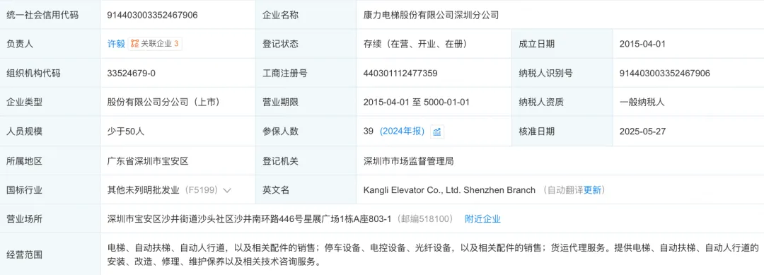 康力电梯股份有限公司深圳分公司,成立于2015年,2024年缴纳社保的人员有39人。具有电梯安装维修资质。