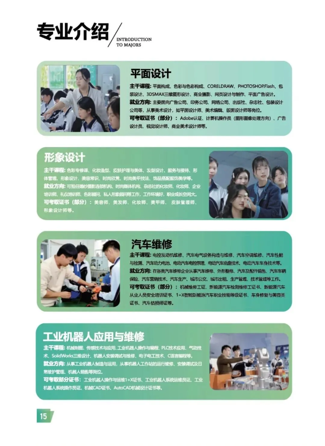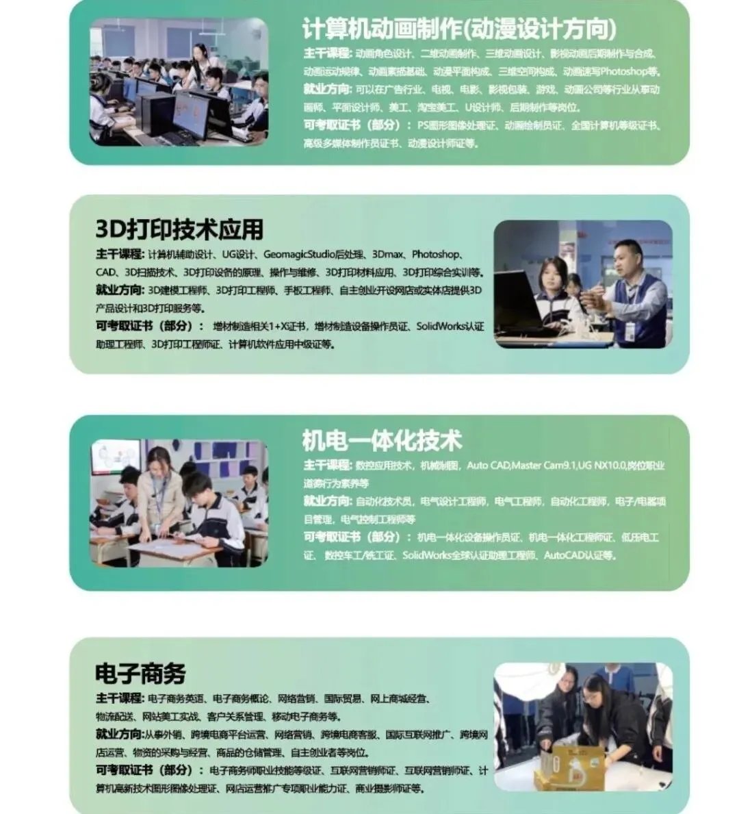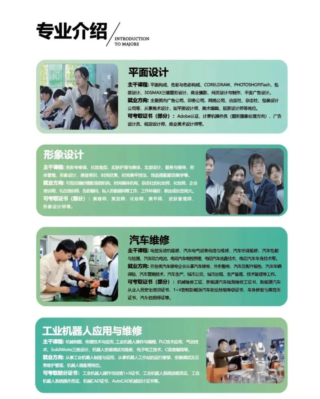 学校拥有200余间现代化教室,每间教室均有空调、投影仪、摄像头等现代化设施,以满足教学需要。学校有教学用计算机2000余台,其中电子商务实训平台共有1000多个机位,可供1000多名学生同时上机实训。平面设计、动漫设计、室内设计专业拥有高配置计算机设备500余台。此外,学校还建有汽车维修、中西面点、中式烹饪、工业机器人、3D打印技术、跨境电商、幼儿教育、护理、舞蹈表演等十余个配套完善、功能先进的实训中心,为同学们专业技能的学习和训练,提供了有力的保障!
