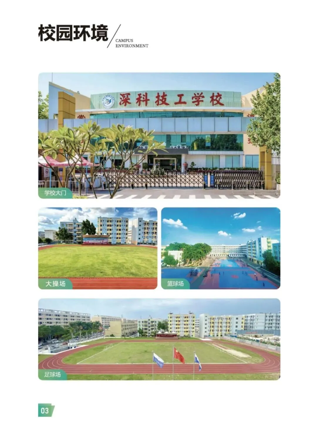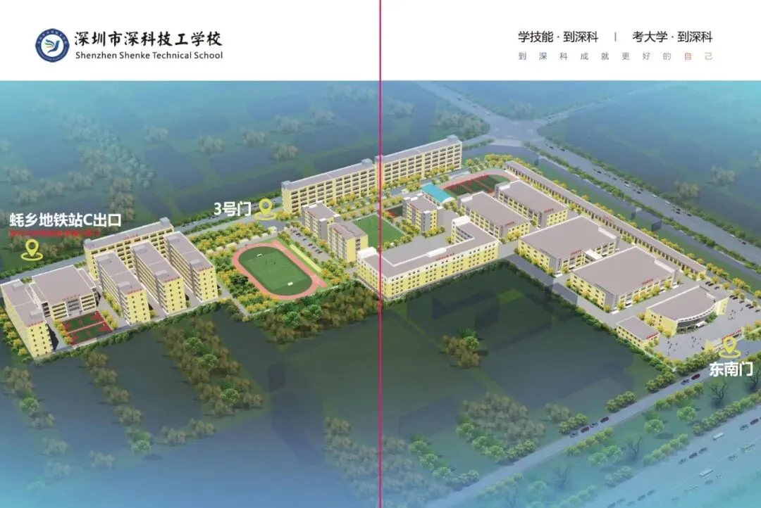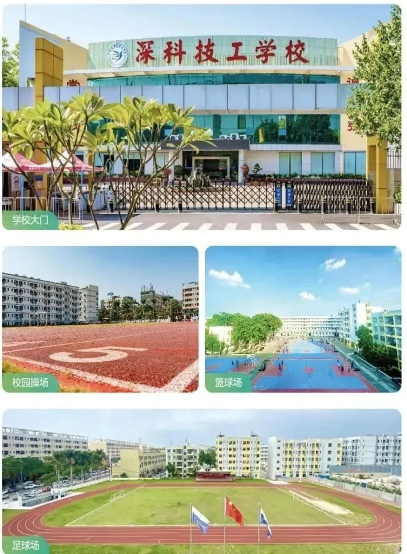 深圳市深科技工学校是深圳市人力资源和社会保障局批准设立的一所新型的现代化全日制技工学校。学校位于深圳市宝安区松福大道4304号,靠近深圳外环高速沙井北出口,距广深城际轻轨沙井西站五分钟距离,地铁12号线蚝乡站C出口直达学校,交通十分便利。天虹、京基百纳、华润超市等大型商场近在咫尺,生活便利,环境优美。学校占地面积185亩,建筑面积12.89万平方米;现有教学、实训楼、学生公寓、教师公寓共19栋。校园内,学生公寓、食堂、生活超市、医务室、足球场、篮球场、排球场、乒乓球场、电竞娱乐室、报告厅等生活体育娱乐设施一应俱全。学校开设有3D打印技术、工业机器人、电子商务、动漫设计.平面设计等20多个热门专业。