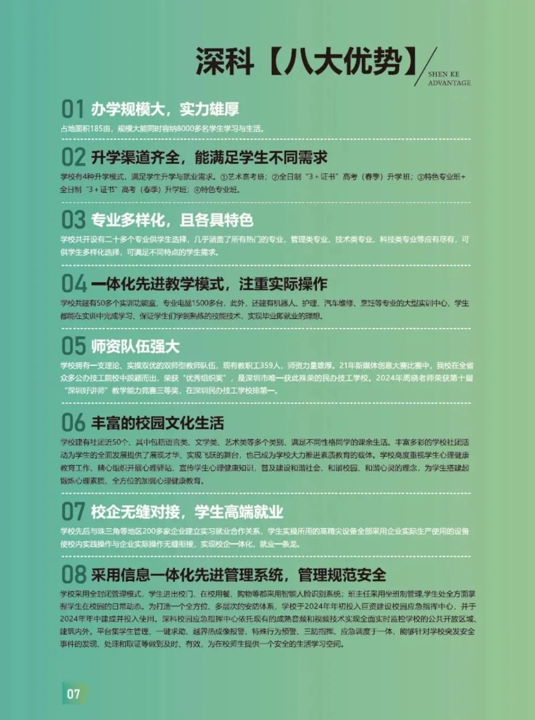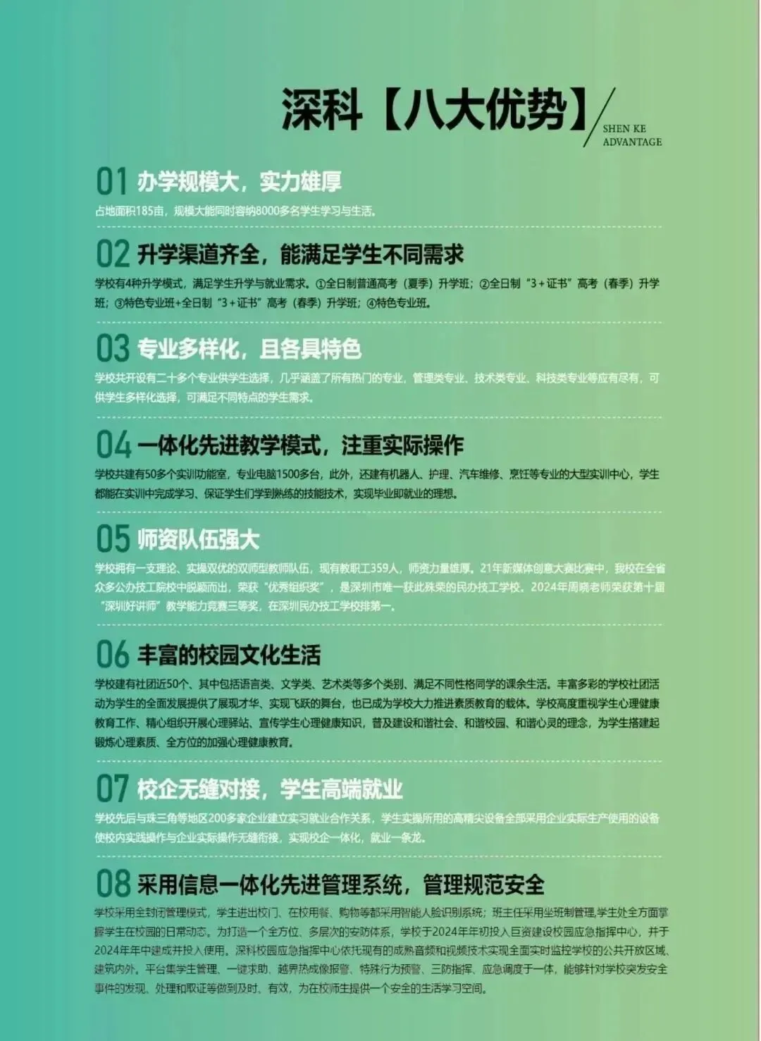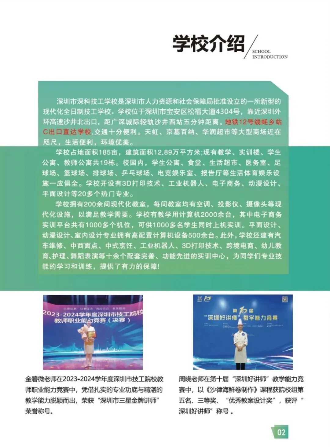 深圳市深科技工学校是深圳市人力资源和社会保障局批准设立的一所新型的现代化全日制技工学校。学校位于深圳市宝安区松福大道4304号,靠近深圳外环高速沙井北出口,距广深城际轻轨沙井西站五分钟距离,地铁12号线蚝乡站C出口直达学校,交通十分便利。天虹、京基百纳、华润超市等大型商场近在咫尺,生活便利,环境优美。学校占地面积185亩,建筑面积12.89万平方米;现有教学、实训楼、学生公寓、教师公寓共19栋。校园内,学生公寓、食堂、生活超市、医务室、足球场、篮球场、排球场、乒乓球场、电竞娱乐室、报告厅等生活体育娱乐设施一应俱全。学校开设有3D打印技术、工业机器人、电子商务、动漫设计.平面设计等20多个热门专业。