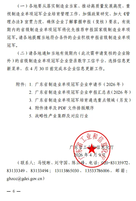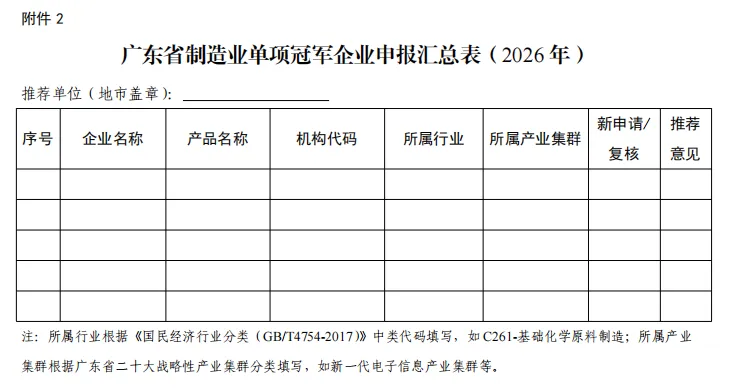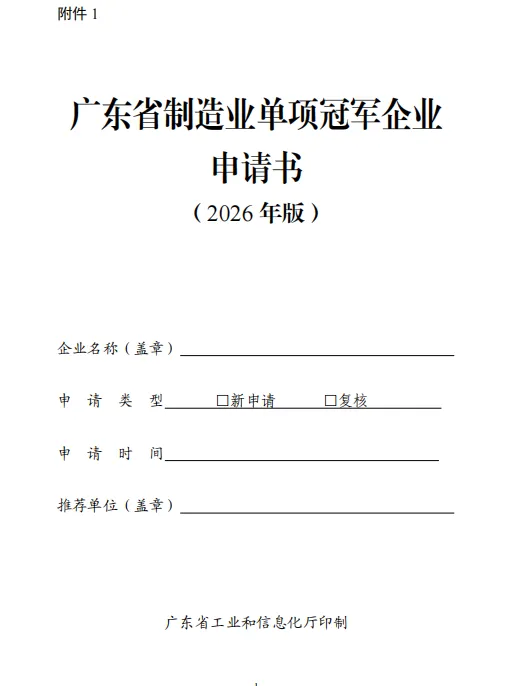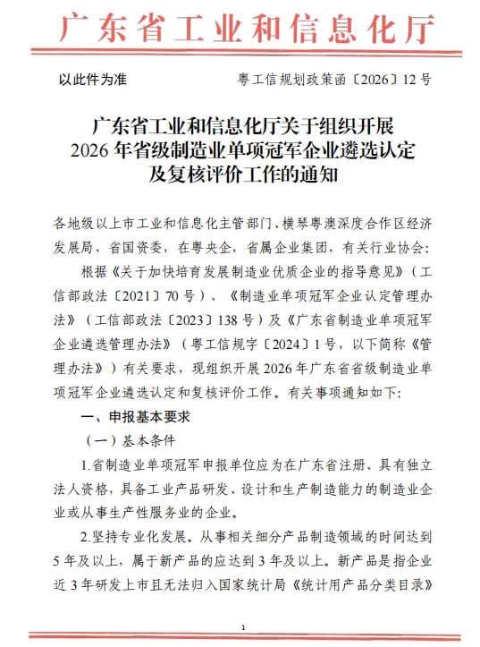 附件:1.广东省工业和信息化厅关于组织开展2026年省级制造业单项冠军企业遴选认定及复核评价工作的通知
