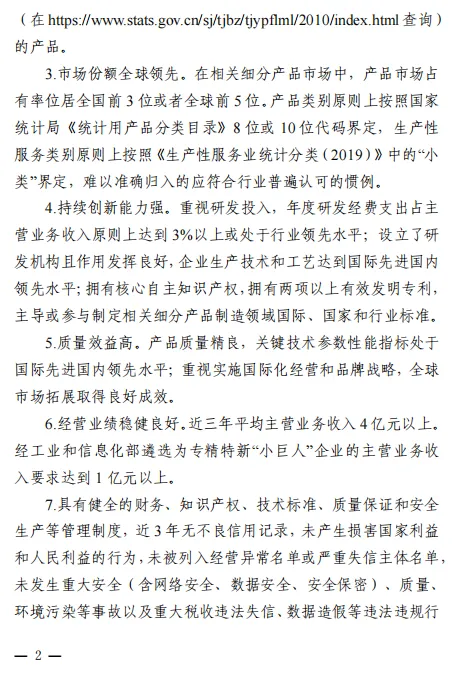 3.市场份额全球领先。在相关细分产品市场中,产品市场占有率位居全国前3位或者全球前5位。产品类别原则上按照国家统计局《统计用产品分类目录》8位或10位代码界定,生产性服务类别原则上按照《生产性服务业统计分类(2019)》中的“小类”界定,难以准确归入的应符合行业普遍认可的惯例。