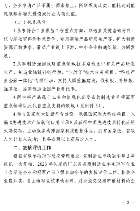 根据省级单项冠军动态管理要求,省制造业单项冠军每3年组织一次复核。2023年认定的广东省省级制造业单项冠军企业(含示范企业和冠军产品)须参加今年的复核评价工作。相关企业应如实、自主填写复核申请材料。对未提交复核申请材料的企业将依据《管理办法》撤销认定。复核工作按照《管理办法》要求执行。
