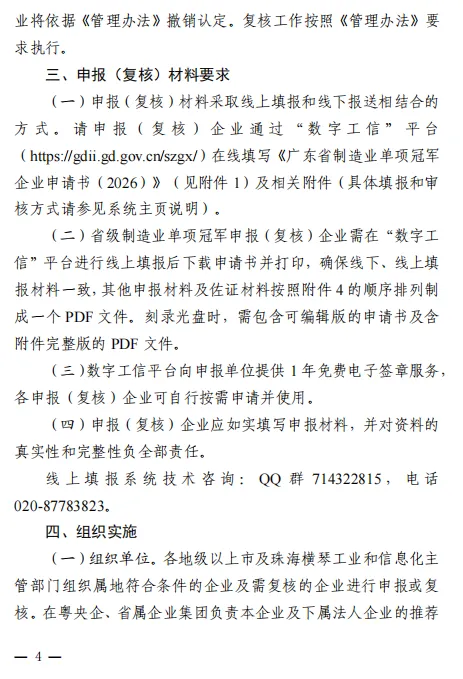(一)线上填报方式:1.请申报(复核)企业通过“数字工信”平台(https://gdii.gd.gov.cn/szgx/)在线填写《广东省制造业单项冠军企业申请书(2026年)》(见附件2)及相关附件(具体填报和审核方式请参见系统主页说明)。2.数字工信平台向申报单位提供1年免费电子签章服务,各申报主体可自行按需申请并使用。3.申报(复核)企业应如实填写申报材料,并对资料的真实性和完整性负全部责任。4.线上系统填报截止时间为2026年5月6日(星期二)18:00。