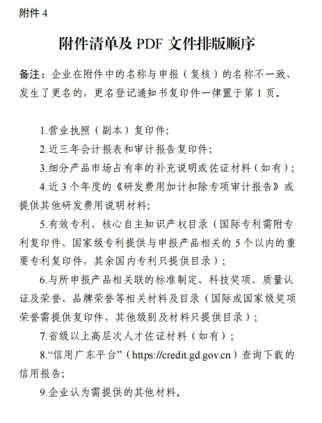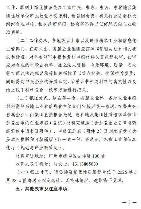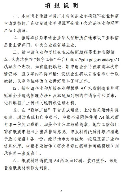 1.请各区动员辖区内企业积极申报(复核)广东省级制造业单项冠军企业,组织企业在广东省数字工信平台做好进行线上申报(具体操作详见附件6),并做好线上相关材料初审工作,对企业的市场占有率、独立法人资格,有无环境、质量、安全等方面违法违规记录等相关指标予以重点核查,确保推荐质量;同时需对申报企业的资质认定、荣誉证书相关材料的真实性进行核查。