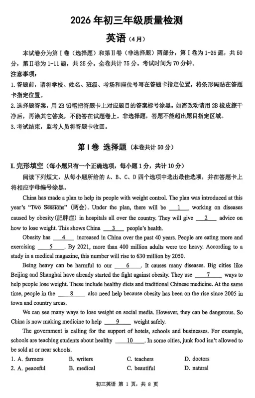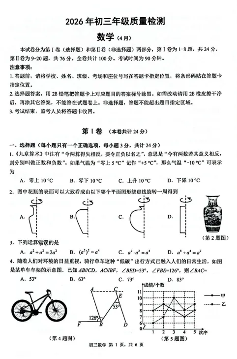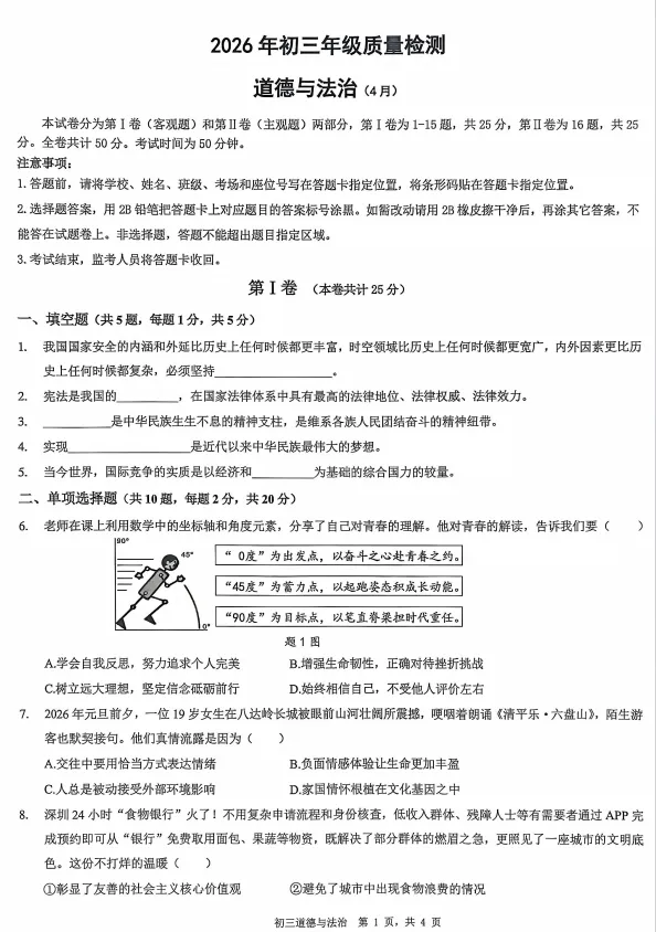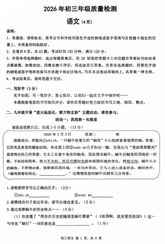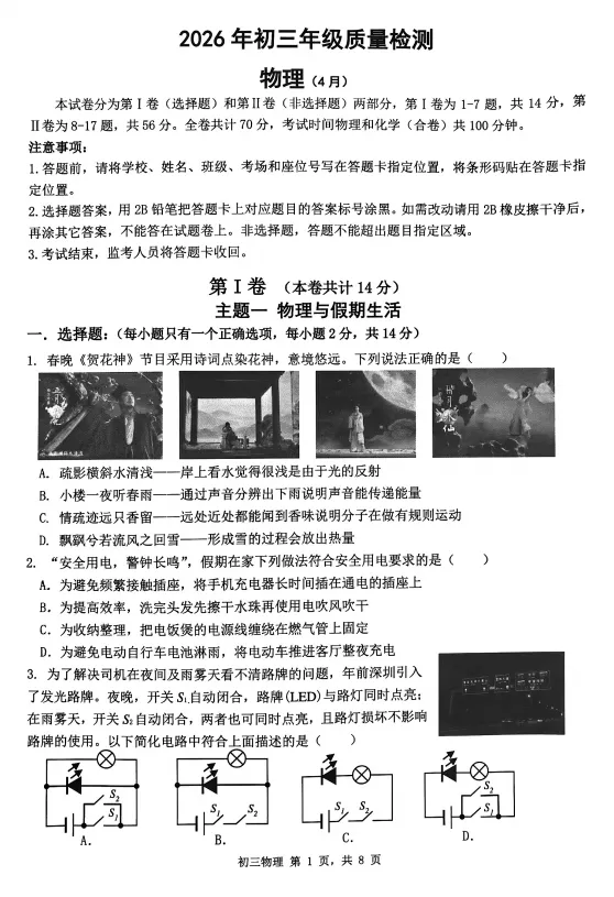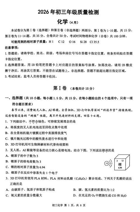 2026年4月深圳市34校初三联考试卷及答案