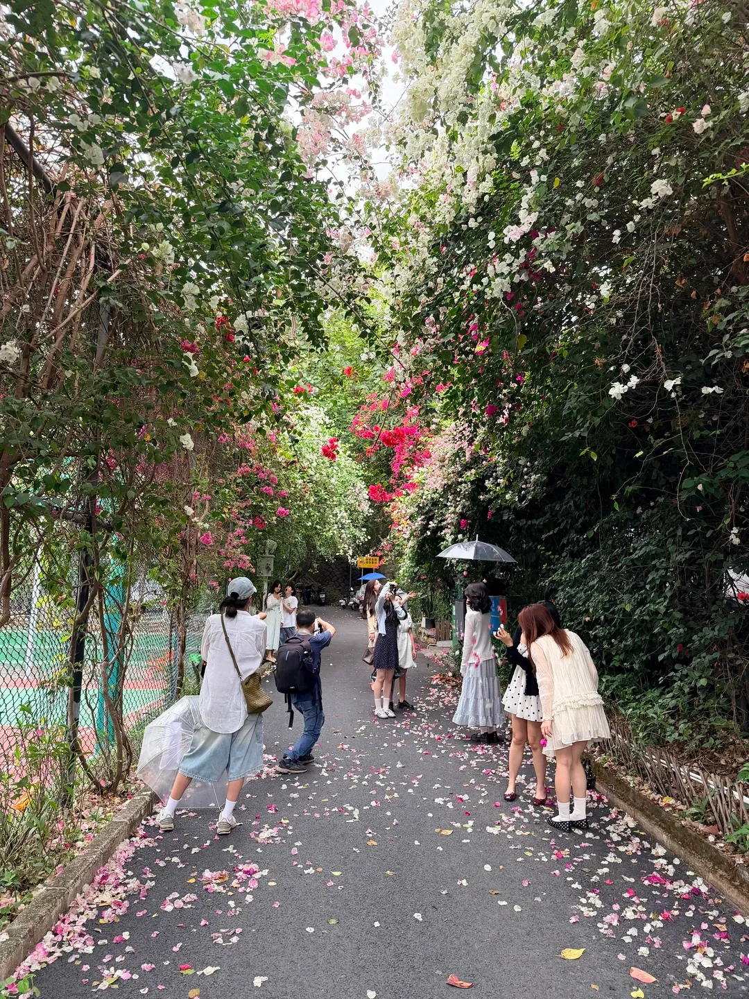 整条路被花盖住,抬头是花、低头也是花。粉的白的一串串垂下来,风一吹花瓣往地上掉,氛围感拉满。