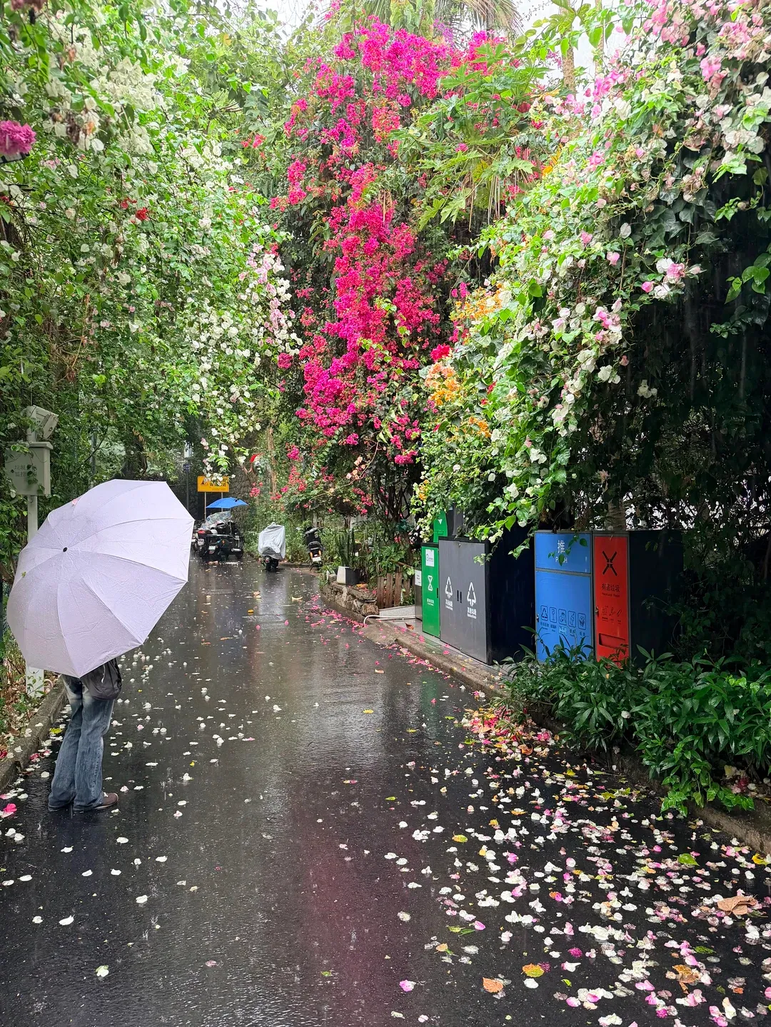 晴天光线好,花颜色特别艳;下雨天路面反光,撑着伞走更有感觉,像进了漫画场景。