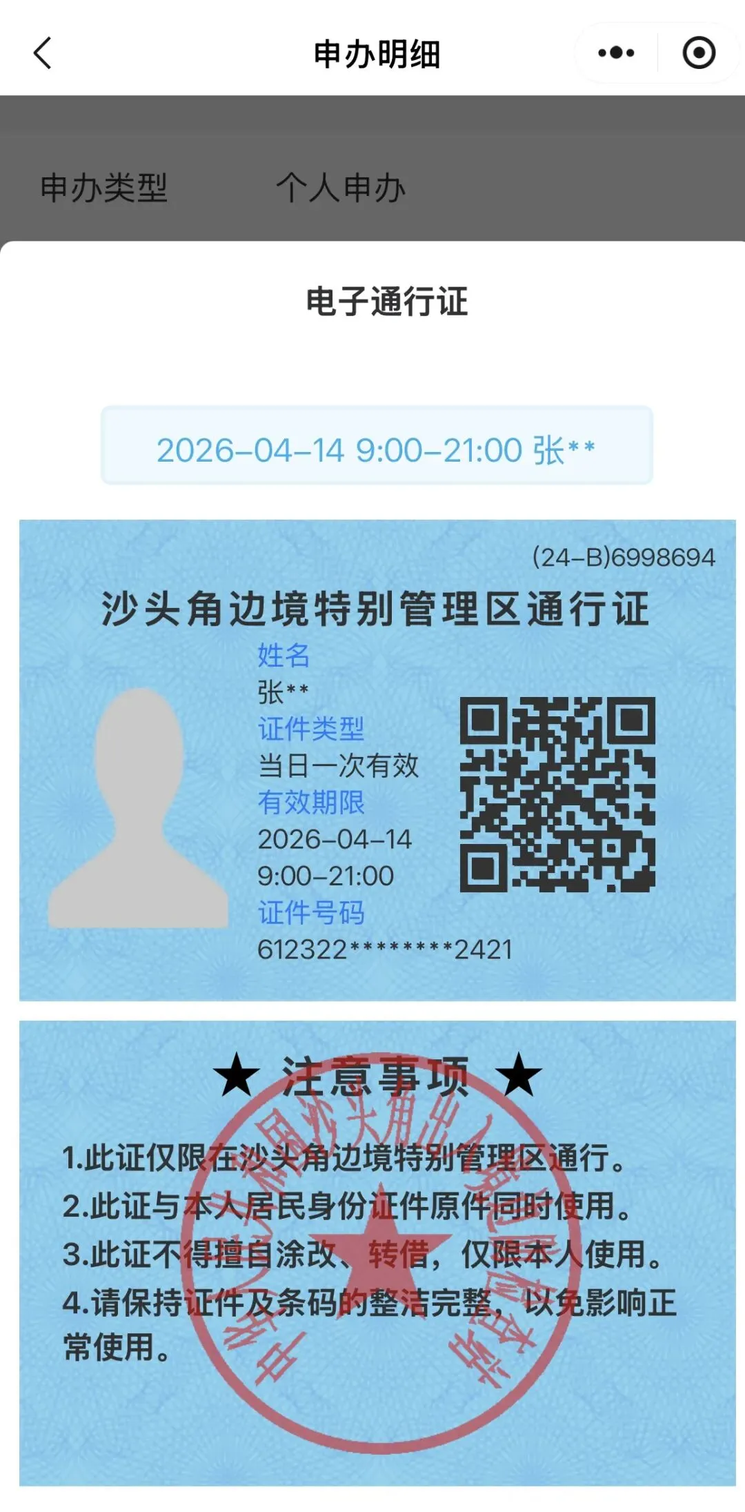 我们在“豆包”的帮助下,利用微信小程序搜索“沙角头边境特别管理区通行征预约”,然后点一下“中英街预约”,微信登陆后填写个人信息,提交申核,差不多三五分钟我们把线上通行证办理好了。