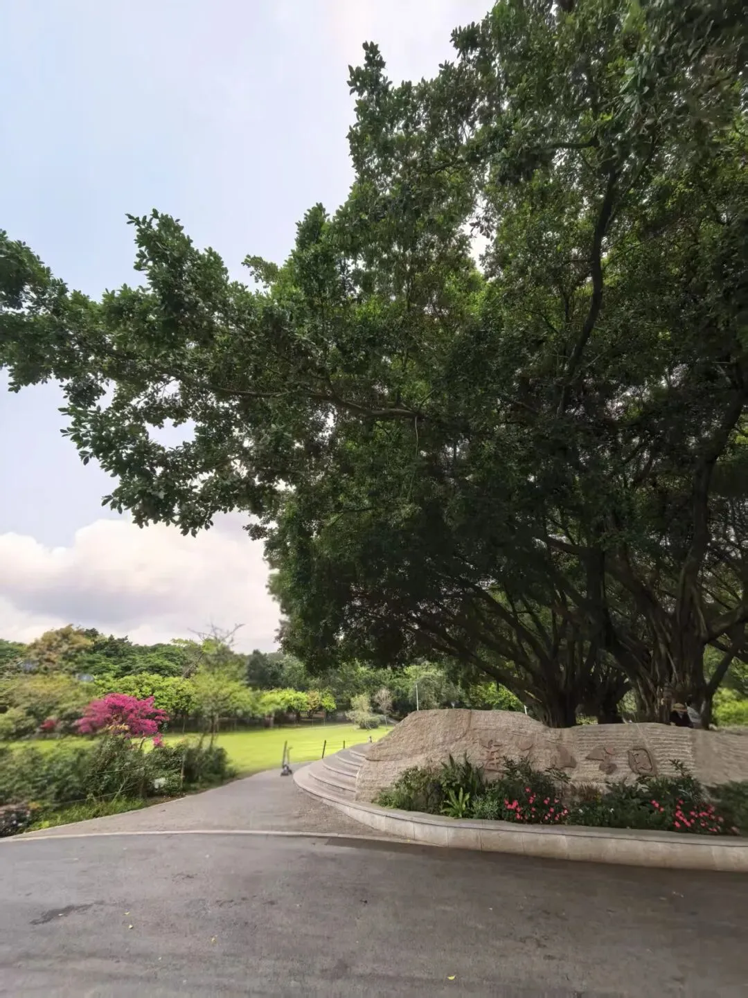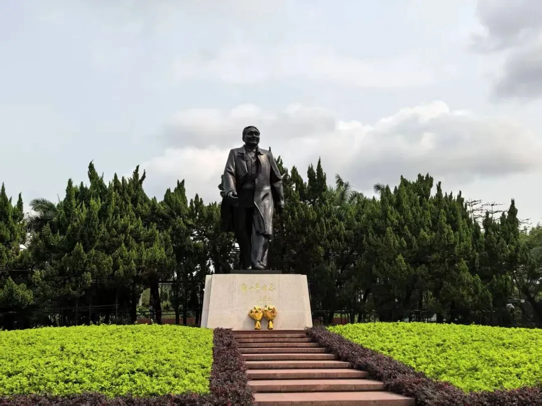 今天早上7点半准时吃早餐,8点15分从酒店出发乘深圳地铁1号线到福冈,转乘3号线到少年宫,一出地铁没走几步就到了深圳莲花山公园。莲花公园绿意浓浓,榕树、棕榈树、樟木等亚热带植物错落有致,各种鲜花竞相开放,草坪茵茵,我们沿着弯曲的步道往前走,到处是树荫,根本不用撑遮阳伞,登了很多台阶,终于登上山顶了。山顶广场矗立着邓小平同志青铜塑像,高大威武,铜像面朝南方,步伐坚定,目光深远。广场上的游客争着和伟人塑像合影,我们等了一会儿,也如愿以偿和小平塑像合影了。