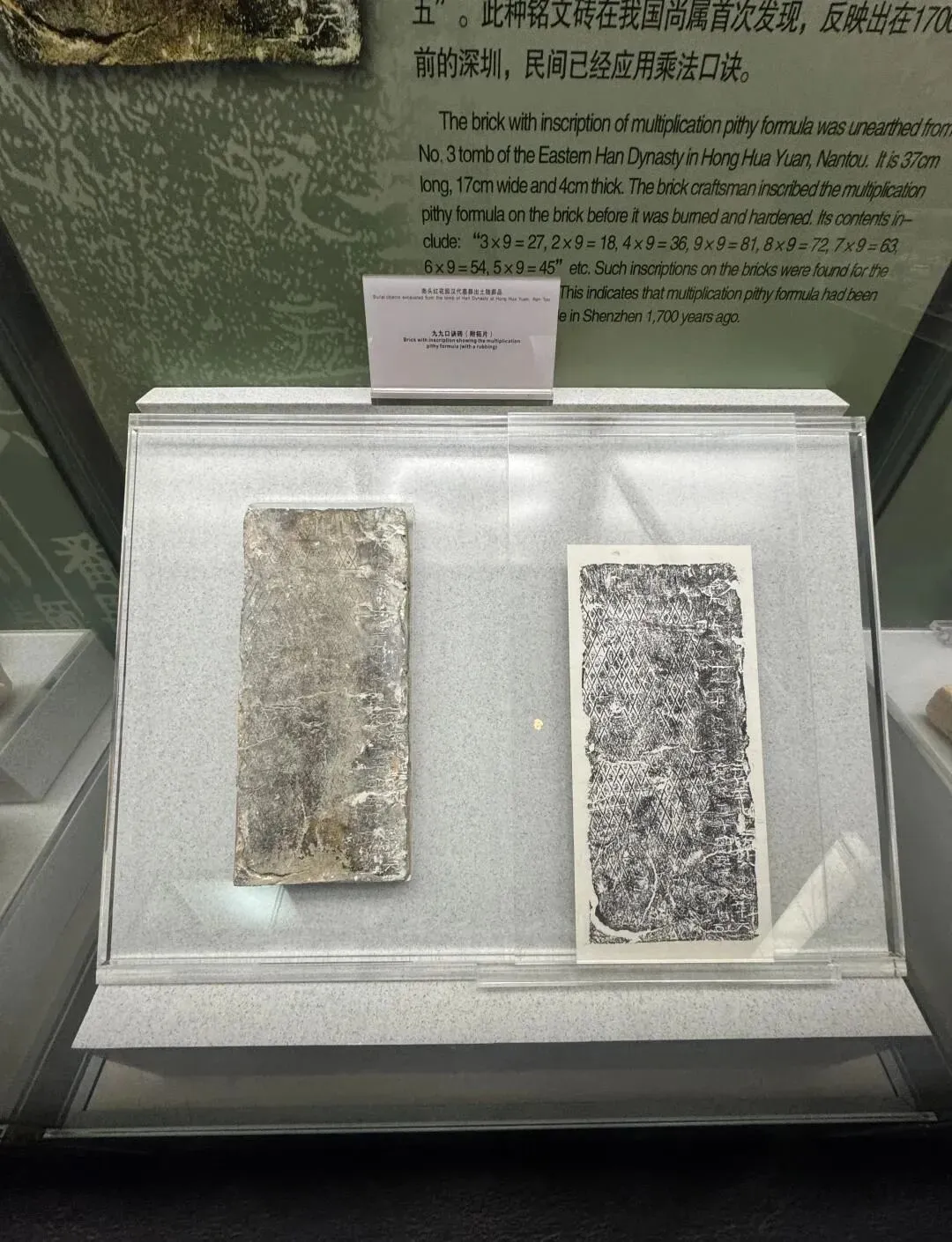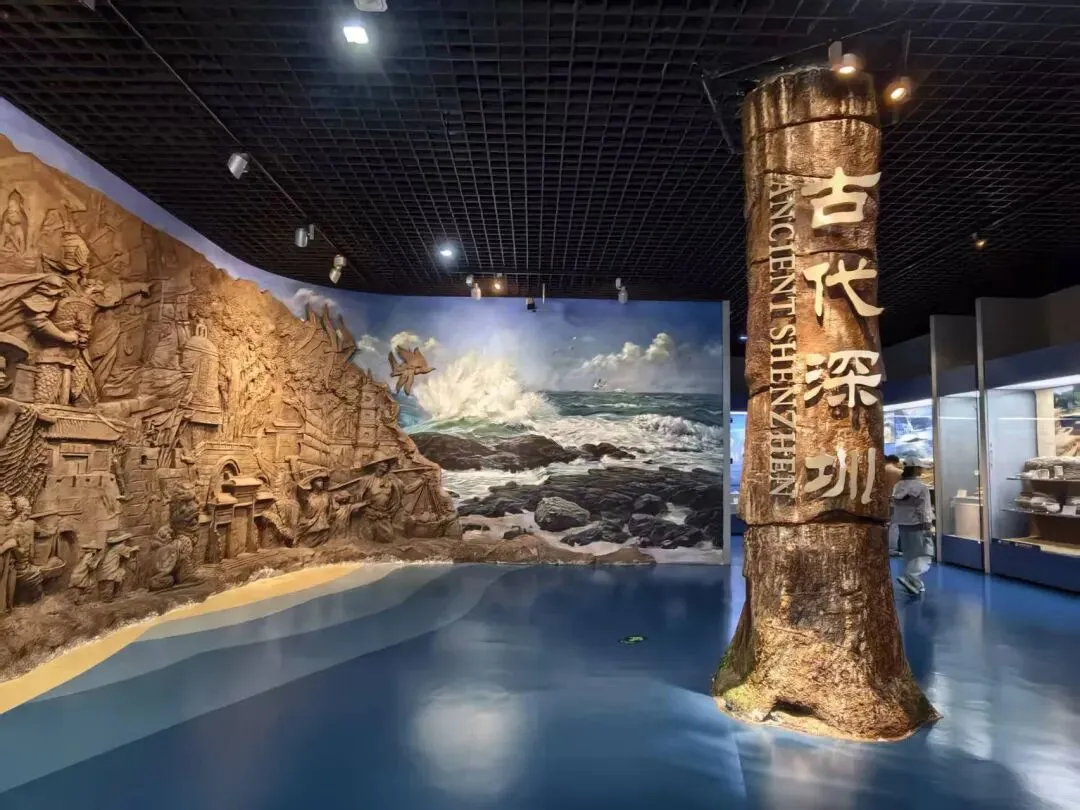 深圳博物馆是国家一级博物馆,现代宏大,玻璃穹顶,环形中庭。是它完整串联了深圳从远古先民到国际都市的7000年脉络。上电梯,我们从二楼“古代深圳 + 近代深圳”开始参现,从咸头岭彩陶、百越先民、汉代盐场、海上丝路节点记载着远古到明清深圳地区古代文明的繁荣和发展。镇馆之宝——东汉“九九乘法囗诀”陶砖。证明了至少在1800年前,岭南地区已熟练掌握乘法运算。从鸦片战争、九龙海战、中英街形成、抗战东江纵队记载了深圳地区的近代苦难历史。