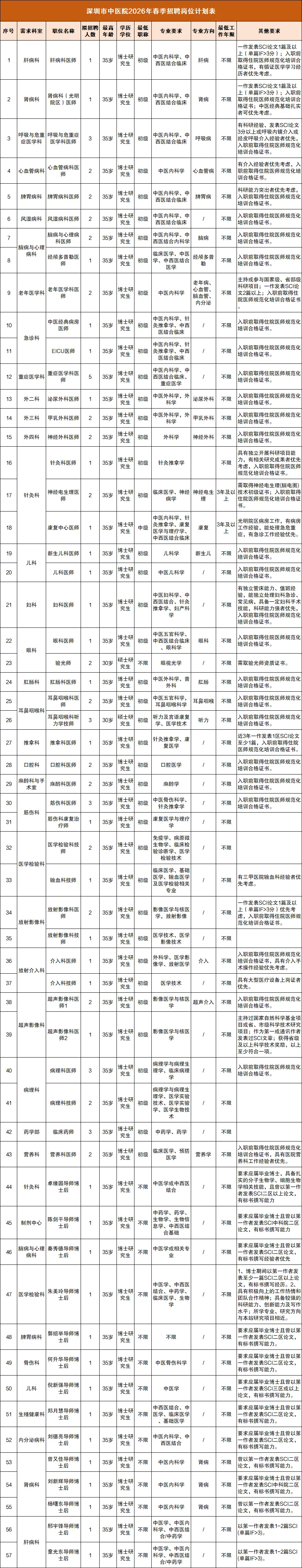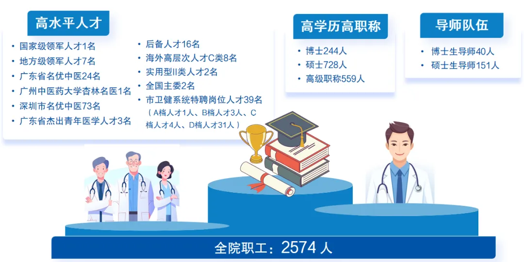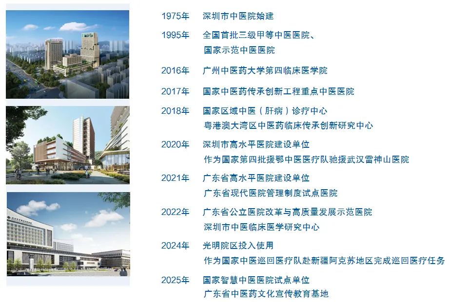 深圳市中医院始建于 1975 年,是全国首批三级甲等中医医院。现有福田院区床位 1,200 张,光明院区一期规划床位 2,000 张。医院设有福田院区、光明院区、罗湖院区(一门诊)、针灸推拿综合门诊部和科教中心。国考连续 6 年 A+。光明院区已于 2024 年 6 月开业,期待您的加入。