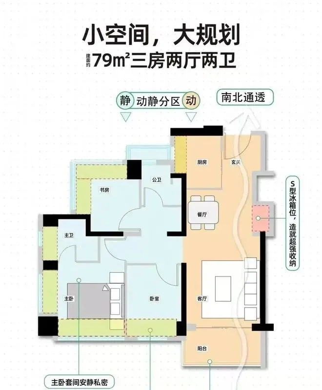 79㎡的3房2厅2卫,设计的是经典竖厅格局,客厅3.3米开间,LDKB一体化,S墙设计预留冰箱卡槽位,动静分区,三开间朝南,3个卧室分别做到了主卧12.1㎡/次卧7.36㎡/次卧6.67㎡(包含墙体飘窗),主卧+1个次卧270°飘窗设计,U型厨房,公卫三段式分离,得房率约88%(包含赠送),东南或西南朝向。