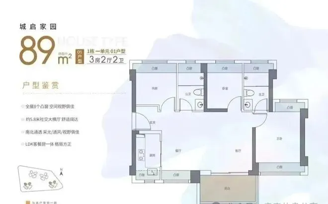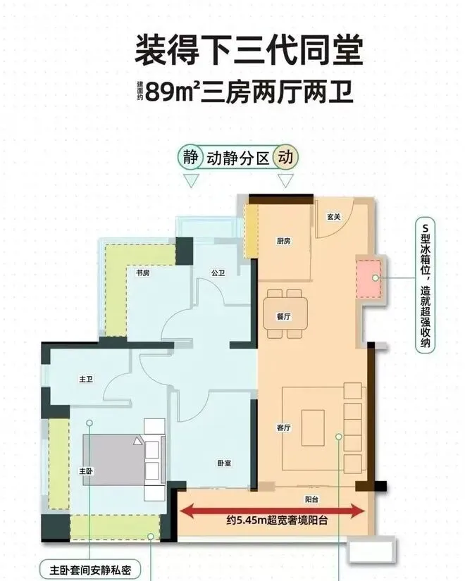 89㎡的3房2厅2卫,02.03户型,设计的是经典竖厅格局,客厅3.4米开间,LDKB一体化,S墙设计预留冰箱卡槽位,动静分区,三开间朝南,3个卧室分别做到了主卧13.79㎡/次卧7.62㎡/次卧6.93㎡(包含墙体飘窗),主卧+1个次卧270°飘窗设计,U型厨房,公卫三段式分离,客厅连接卧室出5.75米长的大阳台,得房率约87.2%(包含赠送),东南朝向。