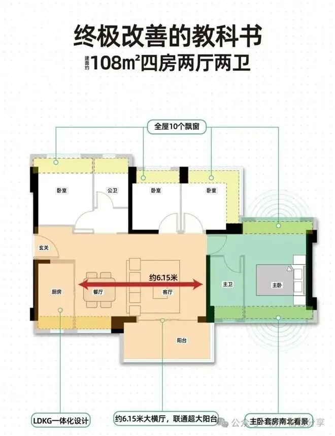 108㎡的4房2厅2卫,设计的是横厅南北通透格局,进门独立玄关,客餐厅6.4米开间,LDKB一体化,五开间朝南,主卧双飘窗通透设计,全屋10个凸窗,4个卧室分别做到了主卧17.01㎡/次卧9.7㎡/次卧8.4㎡/次卧7.35㎡(包含墙体飘窗),L型厨房,卫生间干湿分离,得房率约91.88%(包含赠送),阳台主朝西南或东南向。
