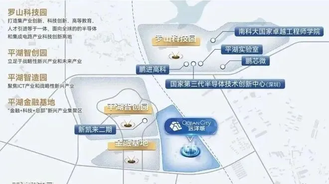 平湖北部新城已建成罗山科技园、平湖智造园、平湖智创园,平湖金融基地,重点发展芯片光刻机、半导体、ICT等新兴产业,打造面向全球的半导体与集成电路产业科技创新高地。