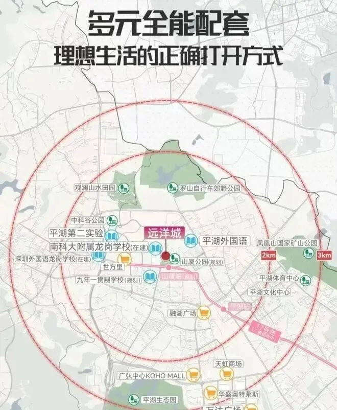项目自带3所幼儿园,周边5所学校环绕:家门口南科大龙岗附属学校(在建中),1km范围内汇聚深外龙岗学校、平湖外国语、平湖第二实验、九年一贯制学校(规划),真正做到家门口就能满足小孩12年的教育需求!(注:具体以教育局公布为准)