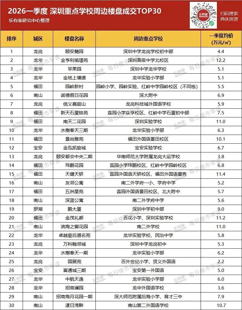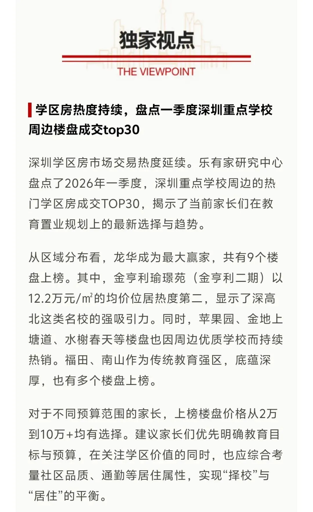 大家好,每天为你带来最新成交数据、学区房动态、公积金政策、城市利好,只讲真实、有用、能帮你买房的干货!从数据可以明显看出,二手回暖速度更快,刚需、改善、学区置业同步入场,市场信心稳步回升。🏫【学区房热度爆表】一季度热门学区盘TOP30正式发布乐有家研究中心刚刚发布:2026年一季度深圳重点学校周边楼盘成交TOP30,学区房热度持续领跑市场。深高北学区热度一骑绝尘,金亨利瑜璟苑(金亨利二期) 均价12.2万/㎡,位列热度第二,名校效应非常明显。苹果园、金地上塘道、水榭春天等热门小区,凭借优质学区+成熟配套,持续霸榜热销。传统教育强区资源稳定,名校周边楼盘依然是家长首选,保值能力突出。上榜楼盘单价从**2万—10万+**都有,无论刚需、改善、高端置业,都能找到对应选择。买学区房不要只看分数和排名,一定要兼顾居住品质、通勤距离、小区物业、流通性。好的学区房,不仅能满足孩子上学,更要住得舒服、未来好卖。💰【全国公积金年报出炉】深圳缴存余额3388.05亿重磅数据!2025年全国33座重点城市住房公积金年报正式发布,深圳表现亮眼:- 深圳公积金缴存余额:3388.05亿元,全国第三- 北京、上海、广州、深圳、杭州缴存额均超1000亿元- 上海缴存余额9466亿居首,北京8957亿紧随其后公积金余额充足=贷款更稳、利率更低、月供压力更小。🎓【深圳教育再升级】5所高校上榜“中国最好大学排名”4月15日,2026软科中国大学排名正式发布,深圳狂揽5席,城市能级再上台阶!- 南方科技大学:全国第30名,首次进30强,创历史!- 香港中文大学(深圳):中外合作办学连续7年第一高校是城市的“未来引擎”,更多名校=更多高知人才=更强购房需求=更稳的房价支撑。📈【楼市资金面利好】一季度地产专项债同比大增42%2026年一季度,房地产相关专项债券发行2250亿元,同比大涨42%,占新增专项债比例19.4%。🧭【房产中介真心话】2026深圳买房,抓住这3点就够了结合今天的所有数据、政策、动态,我给大家最接地气、最实用的建议:深圳高校越来越强、人才越来越多、公积金越来越厚、学区需求持续旺盛,长期持有深圳优质房产,依然是最稳妥的家庭资产选择。2026年的深圳楼市,正在走最稳、最健康、最可持续的回暖路线:学区房领涨、公积金托底、高校加持、资金护航、成交稳步回升。不管你是刚需上车、改善置换、为孩子买学区房,现在都是比较舒服的买房窗口期。不用焦虑追涨,也不必过度观望,遇到合适、价格合理、配套扎实的房子,就可以出手。每日更新笋盘和深圳房产相关,您的点赞与关注,化作我坚持创作的动力*^_^*💝💝💝