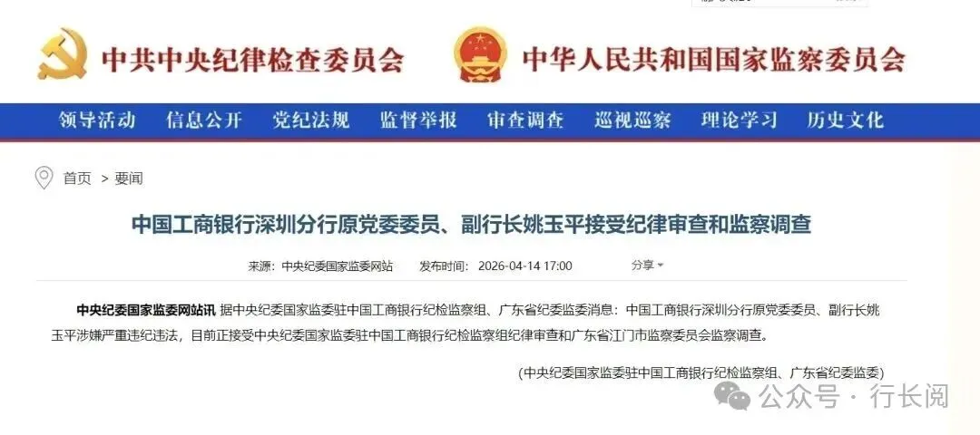 2026年4月14日,中央纪委国家监委网站发布通报,中国工商银行深圳分行原党委委员、副行长姚玉平涉嫌严重违纪违法,正接受中央纪委国家监委驻中国工商银行纪检监察组纪律审查和广东省江门市监察委员会监察调查。