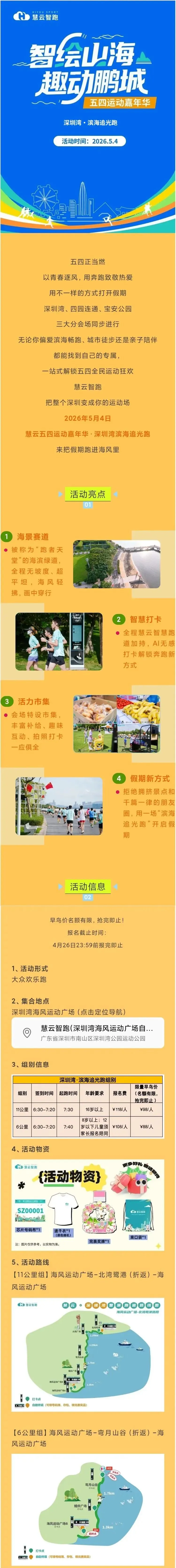 2026慧云五四运动嘉年华·深圳湾滨海追光跑定于5月4日7:30在深圳市深圳湾公园海风运动广场开跑,设11公里、6公里两个项目;先报先得,额满即止!4月26日前报名享受早鸟价!