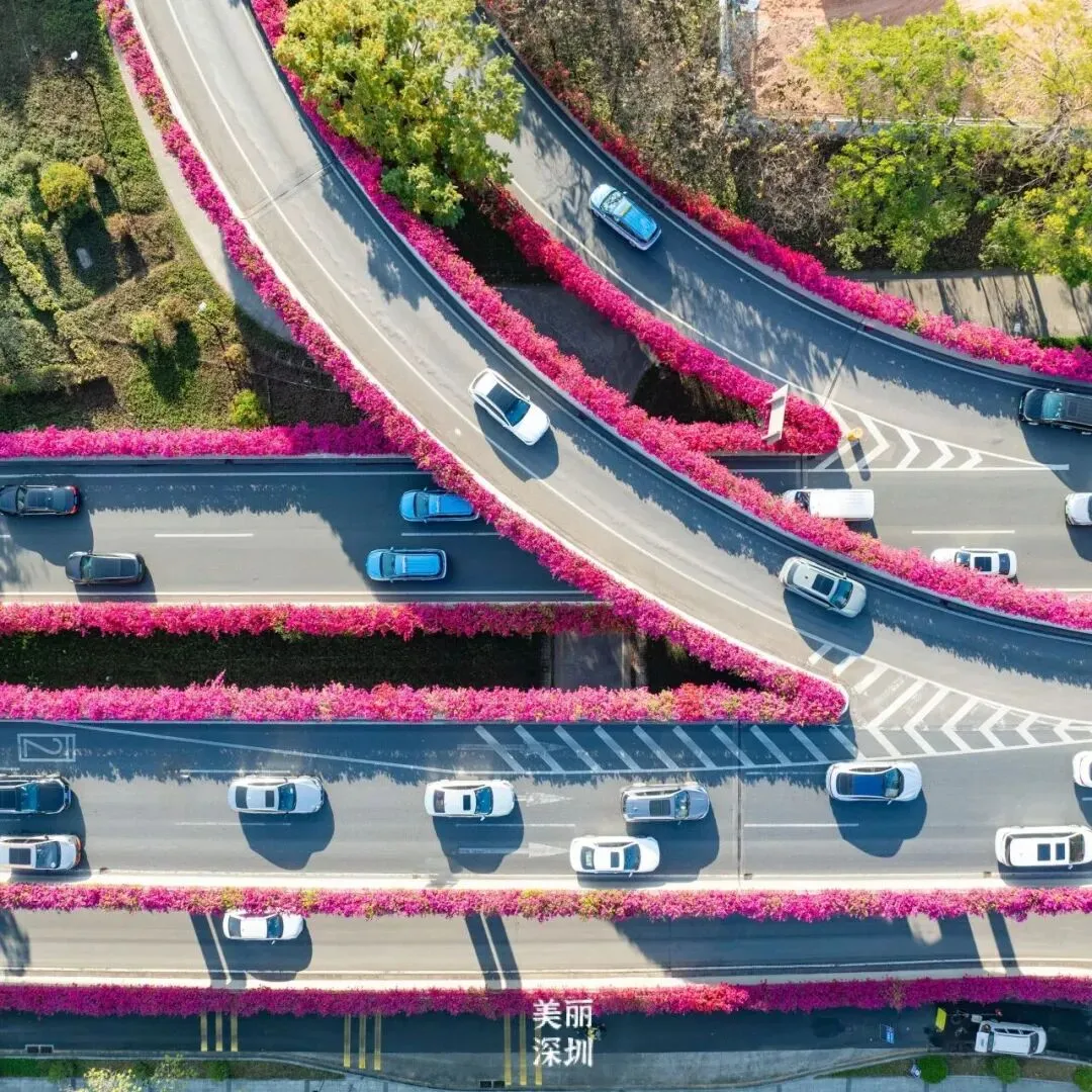 除了香山中街和小区、公园外,在城市的主干道上,流动的玫粉色飘带缠绕在绿化带上,簕杜鹃盛放于各大天桥,将天桥装饰成繁花盛开的花桥。