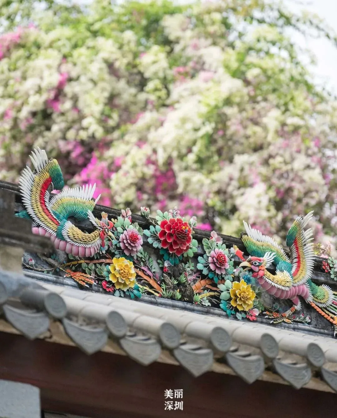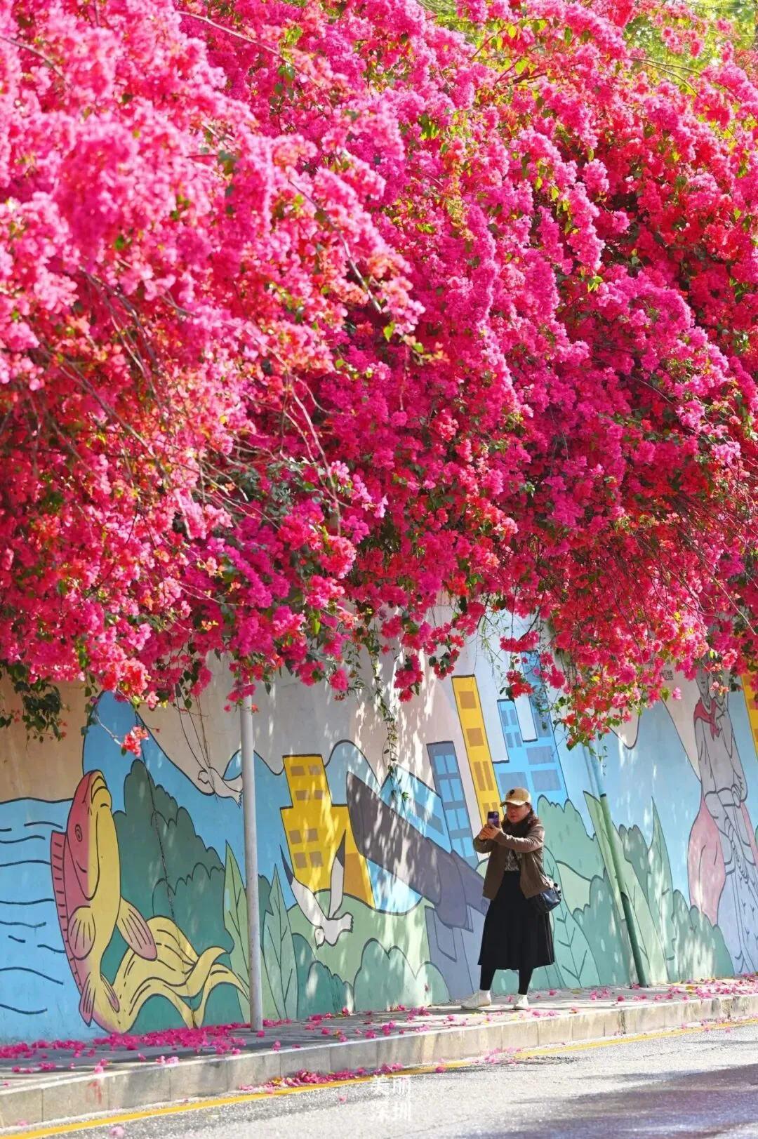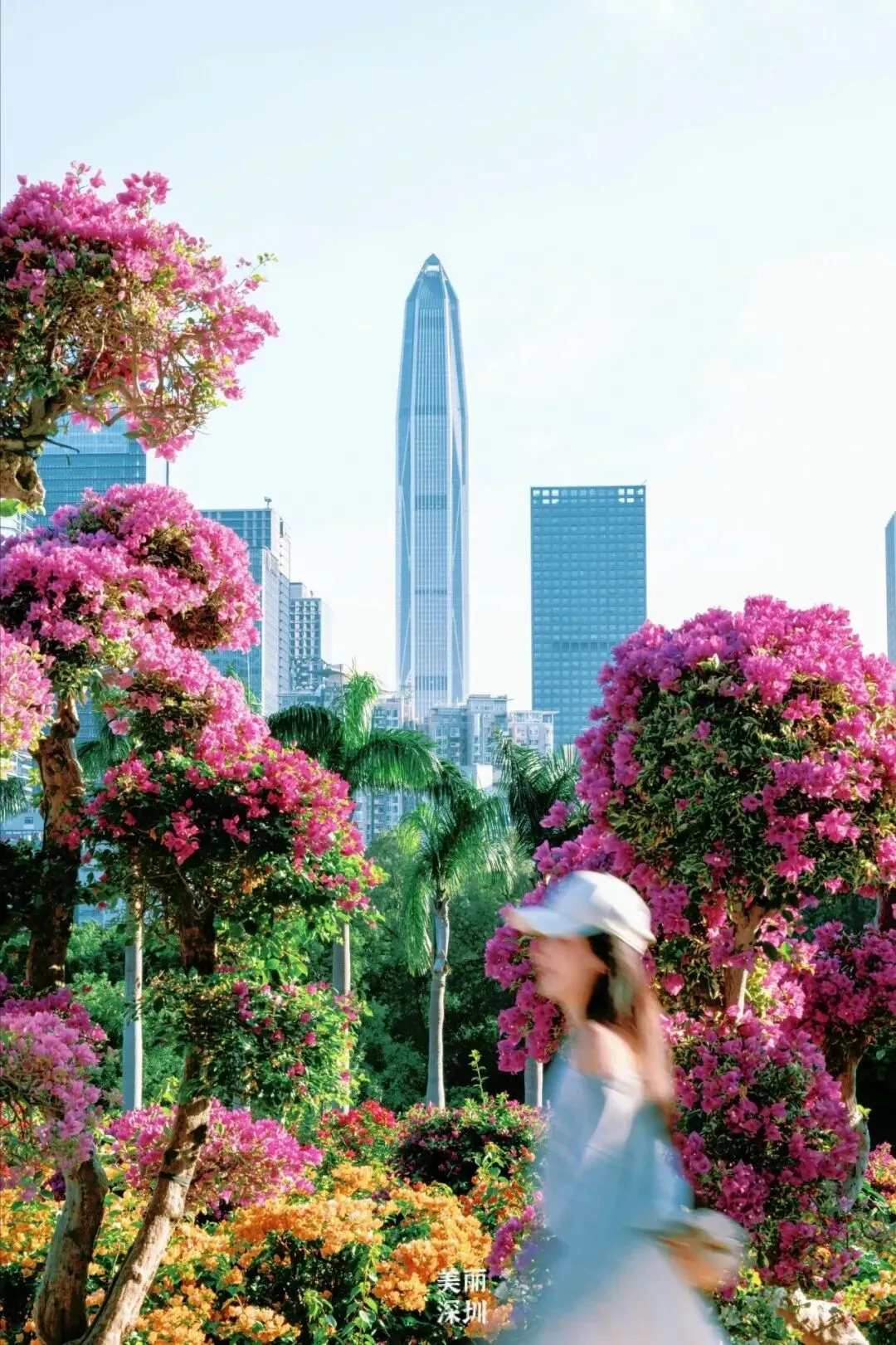 在来深必逛的莲花山公园里,簕杜鹃花墙吸引游人来打卡,游人们一头扎进去,仿佛闯进了“春天”的片场。在园博园,岭南风情的建筑与簕杜鹃交相辉映,鲜花瀑布每年都会如约盛放。