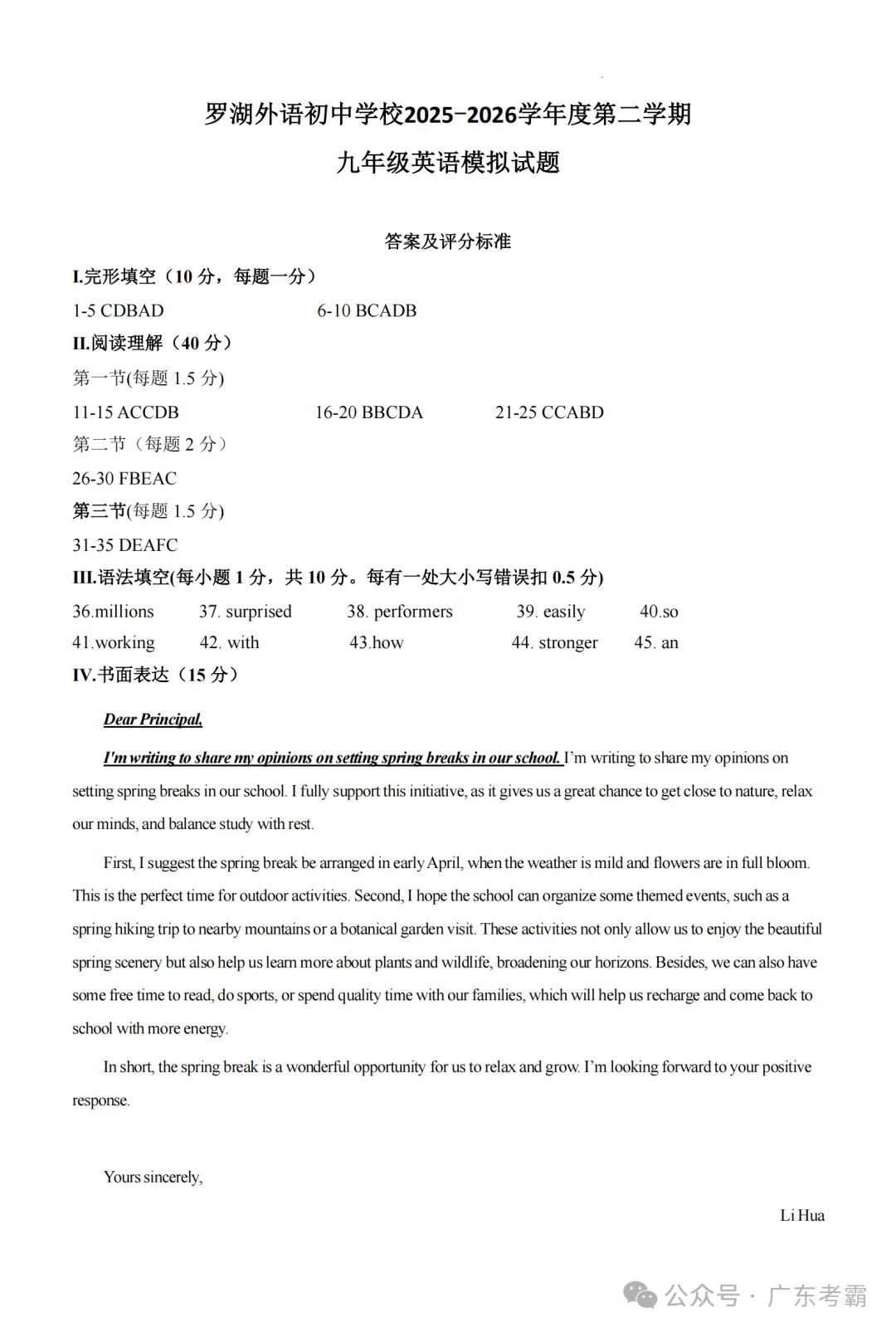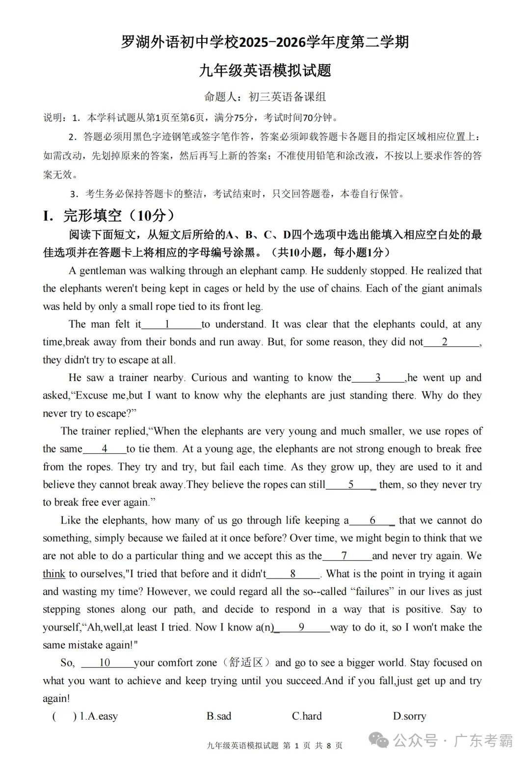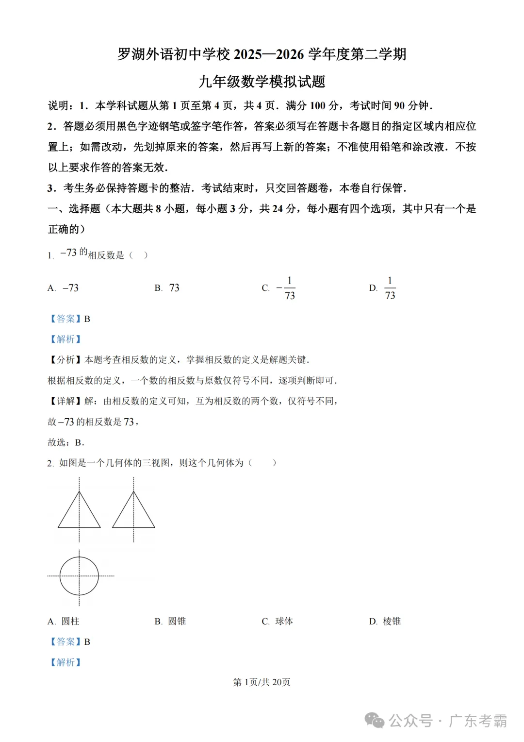 罗湖外语初级学校2026年第二学期模拟试题九年级(数学 | 英语 | 物理|化学)