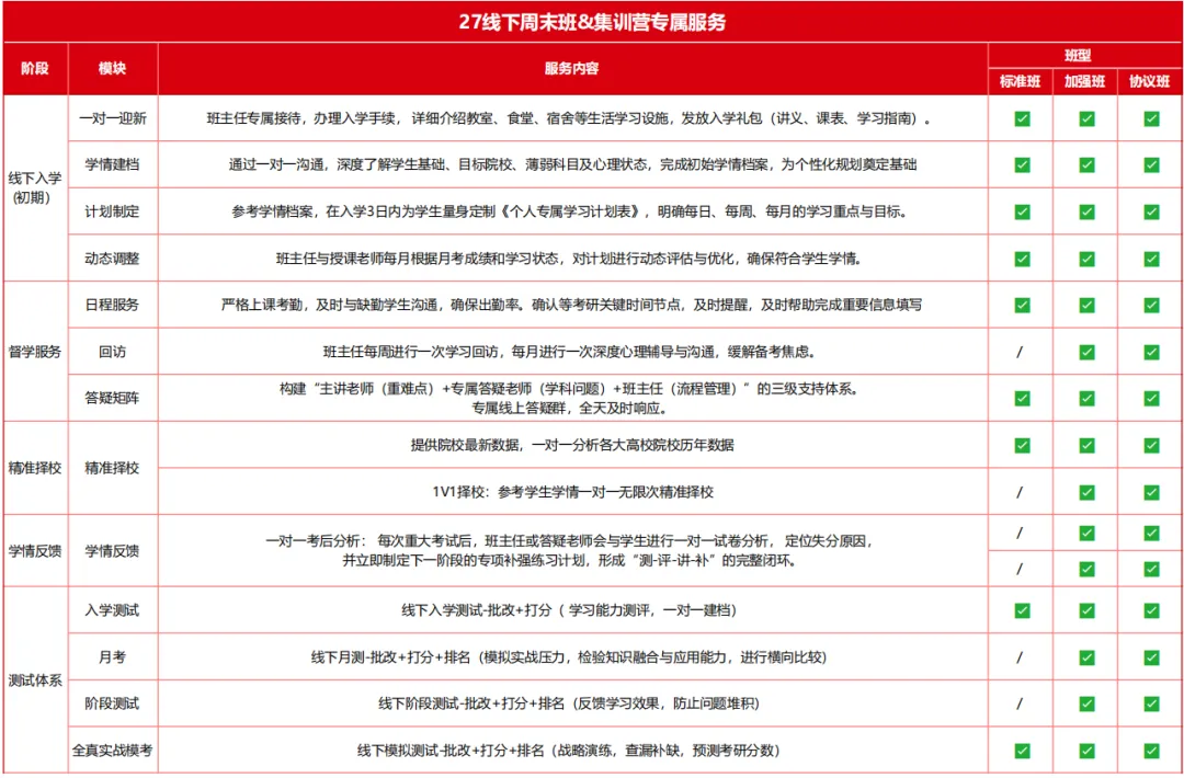 精细督学全程伴学:一对一迎新+学情建档+私人定制学习计划(动态调整),每日考勤、上课提醒、每周回访、月度心理疏导,三级答疑全天在线,全程跟踪不松懈。