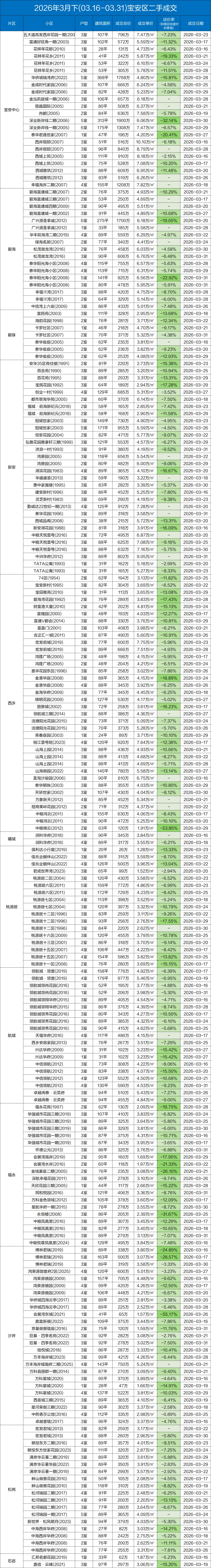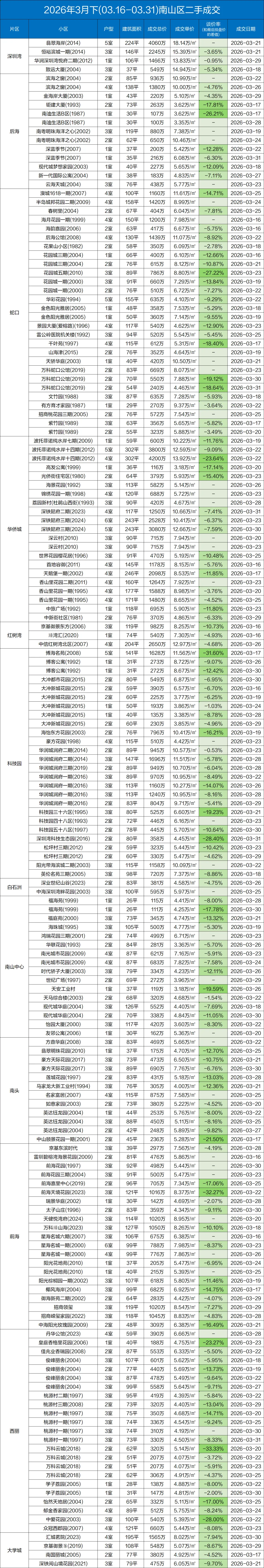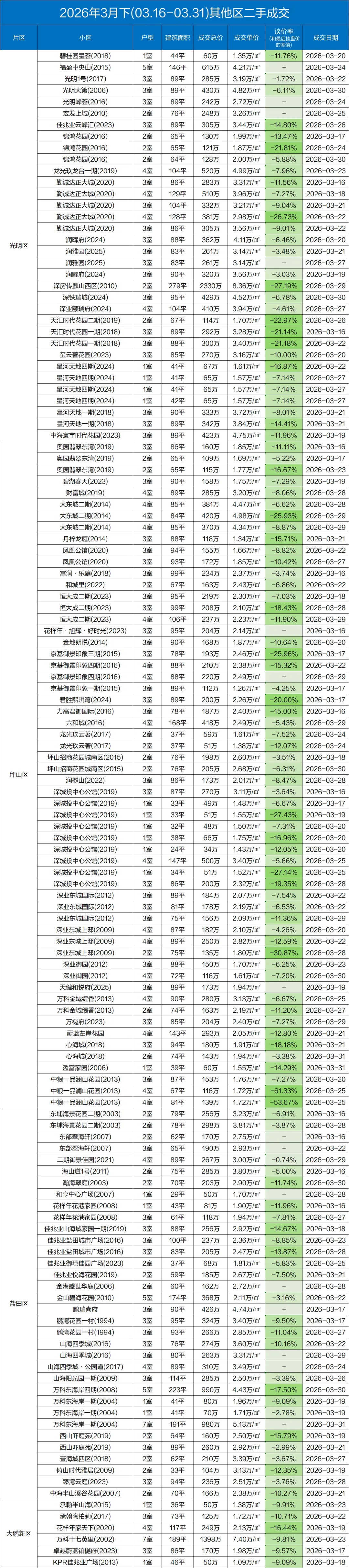 定期整理深圳二手房的成交数据,本次统计时间为:(2026.3.15-3.31)以下为深圳其中几家大机构的总和数据,从挂盘价到实际成交价的浮动率,应该也相当有参考价值了。