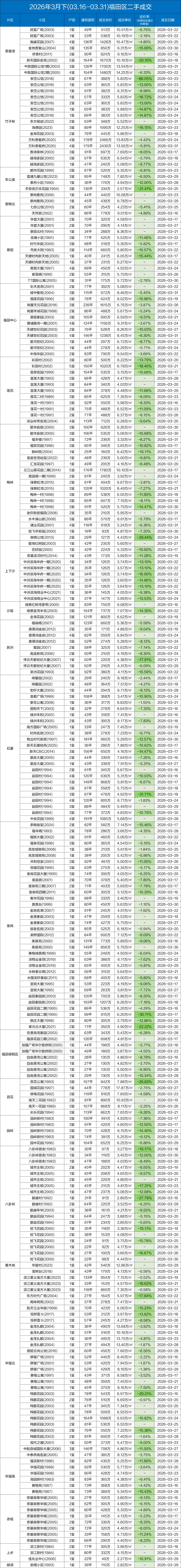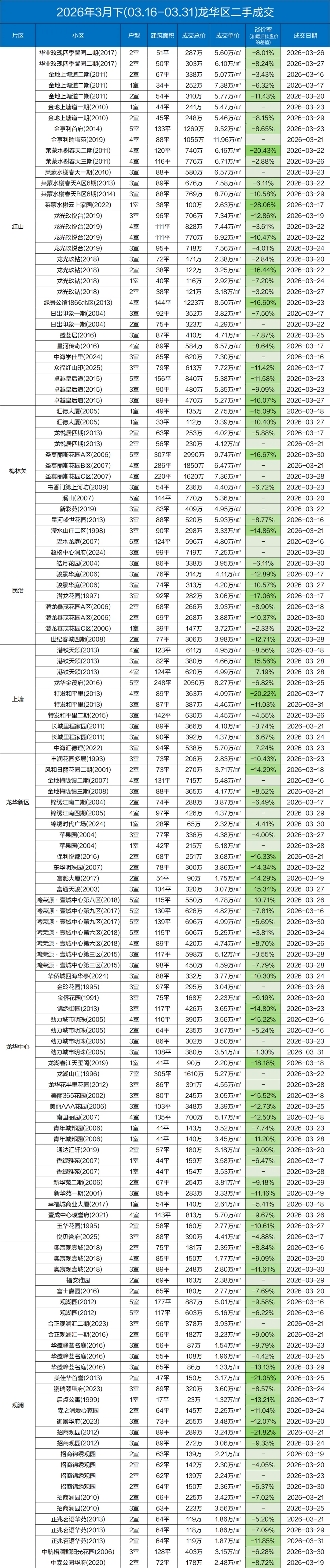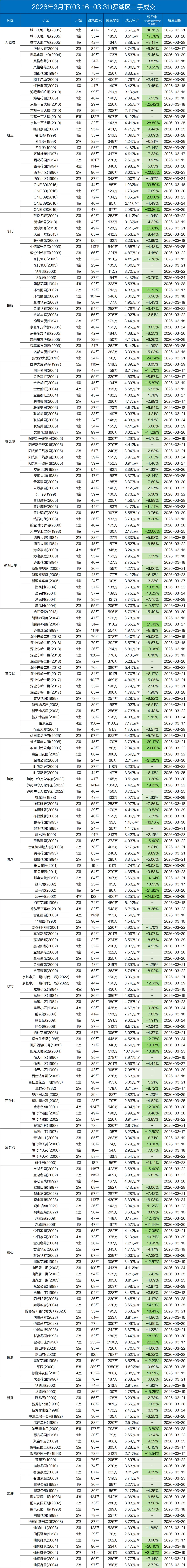定期整理深圳二手房的成交数据,本次统计时间为:(2026.3.15-3.31)以下为深圳其中几家大机构的总和数据,从挂盘价到实际成交价的浮动率,应该也相当有参考价值了。
