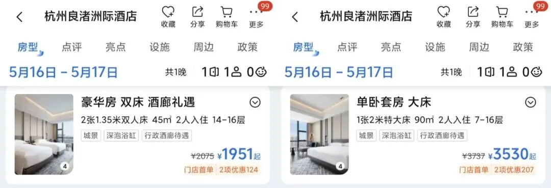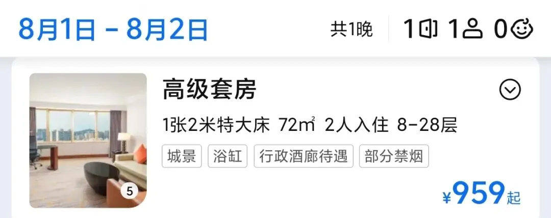 1299元/2晚可拆分(直播间用券减100元),第五等级的高级套房包含每日双早、双人行政酒廊礼遇下午茶及欢乐时光晚间酒水自助餐食、现场live乐队表演;有效期至8.31,五一节仅有3天加200元,其余时间包含暑假和周末全程不加价。