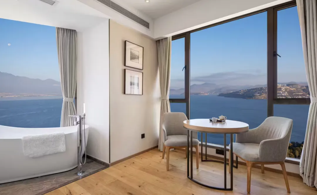 这次套餐给的是她家第六等级的270度豪华海景套房,整个房间风格很温馨舒适,光是这个浴缸直面洱海的景色都值得一住了,泡一泡非常惬意放松。