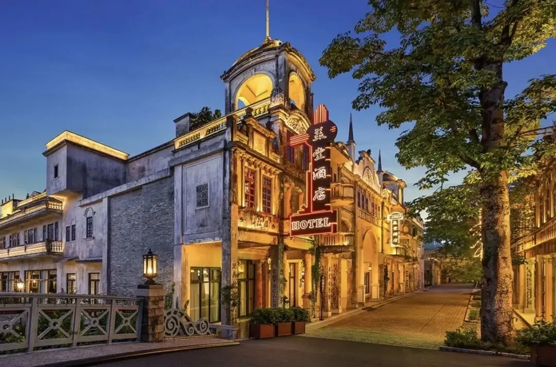 这家就在上面的美堂酒店旁边,也是在景区内C位了,同样2023年开业硬件很不错,以码头轮船为主题融合民国复古+南洋风情,处处都是打卡点。