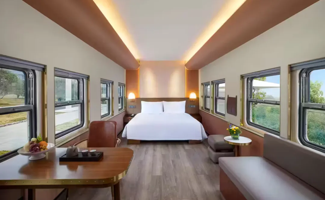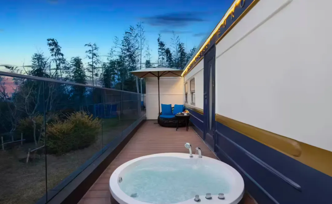 这家列车房极具仪式感,还原了东方列车的复古典雅风格,住进去一秒穿越至诸多经典电影场景里。房间硬件也是很多大牌、卫浴是法恩莎、智能马桶、房间阳台还有圆形按摩浴缸🛁,夏季泡一泡凉爽惬意。如果想要在正常火车上体验这种包厢独立客房,那几晚下来就是好几万块了。