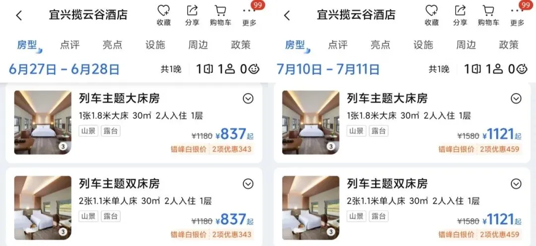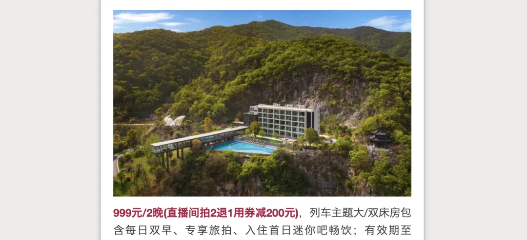 999元/2晚可选2间1晚(直播间用券减100元),列车主题大/双床房包含每日双早、采茶/挖笋/双人下午茶3选1、杨梅季每个房间赠杨梅一篮、专享旅拍、入住首日迷你吧畅饮;有效期至7.15,除五一节外,其余时间含周末全程不加价。