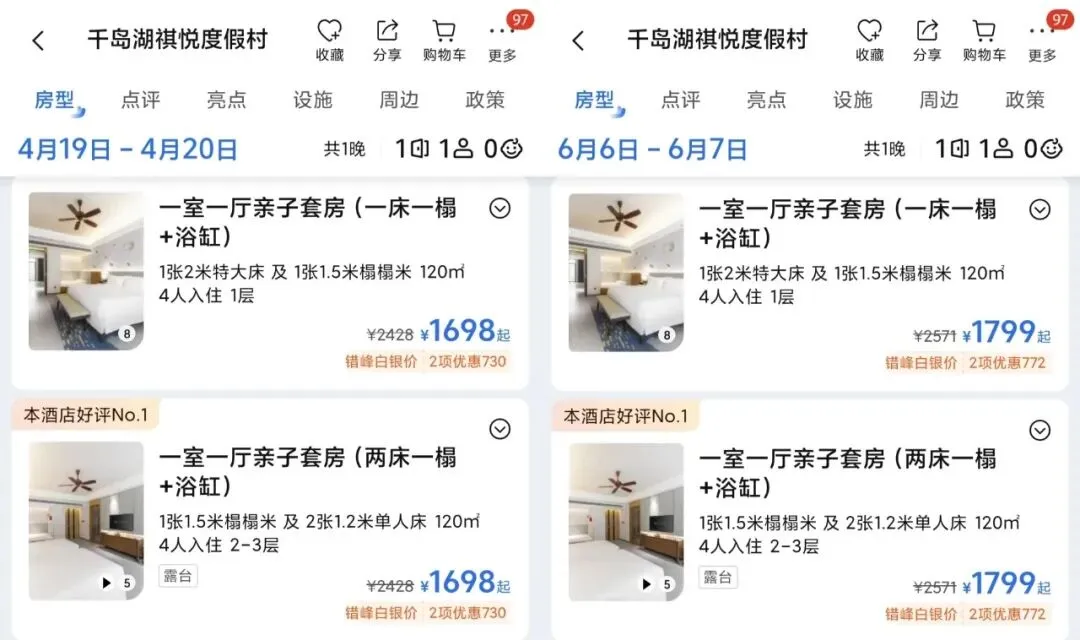 这家是千岛湖著名的一价全包国牌五星度假酒店,位于湖中核心网红桥旁,景色和硬件都很不错。套餐给的房型可以住4个人,这个是大套房+吃喝玩乐一应俱全,正常日历房价格非常稳定,周中1698元、周末1799元/晚,这次券后只要1188元/2晚,省心度假性价比之最。