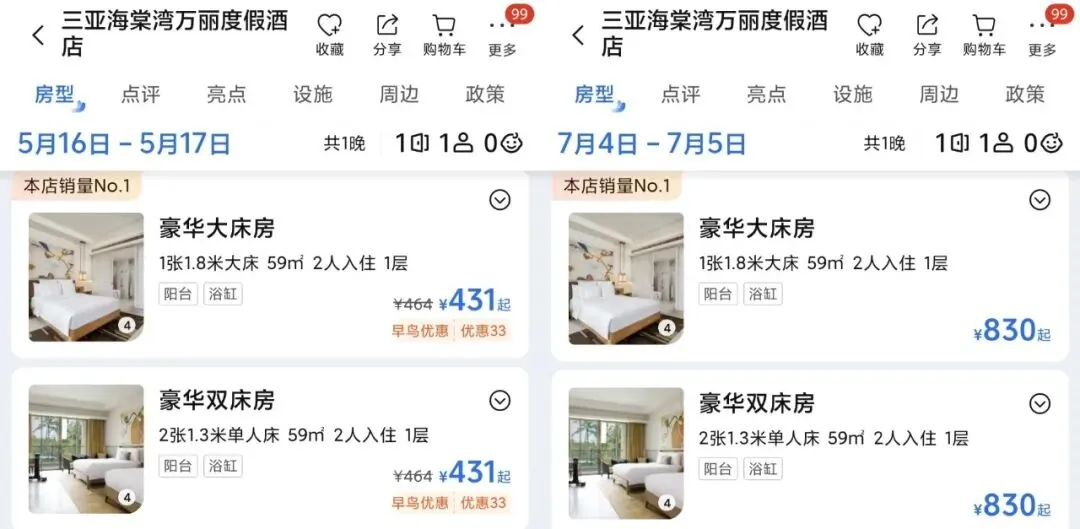 这家是促销常客,但每次都有新鲜感。日历房不含早431~830元/晚,这次券后1329元/4晚真的是白菜价了,折合每晚300块出头住万豪旗下海棠湾一线海滨度假酒店,拆分使用非常灵活方便,带家人朋友入住可以直接2间2晚就搞定,还可以叫酒店安排联通房,秒变超级大套房。
