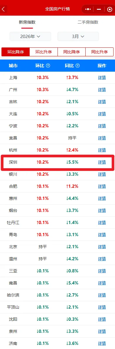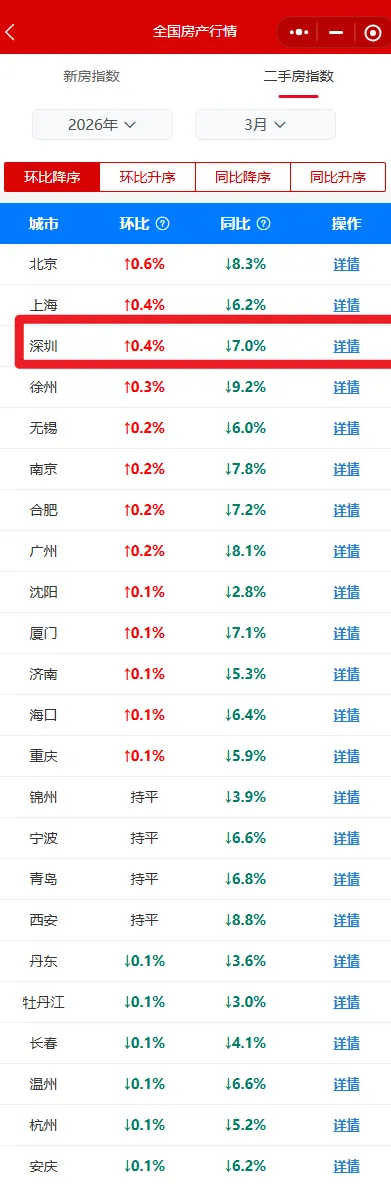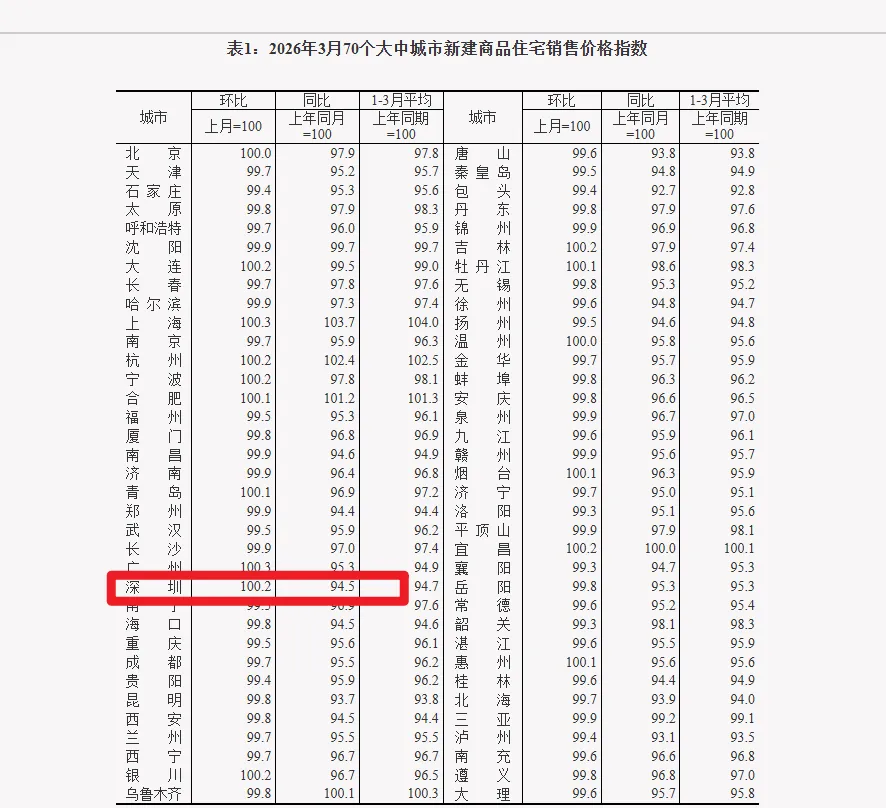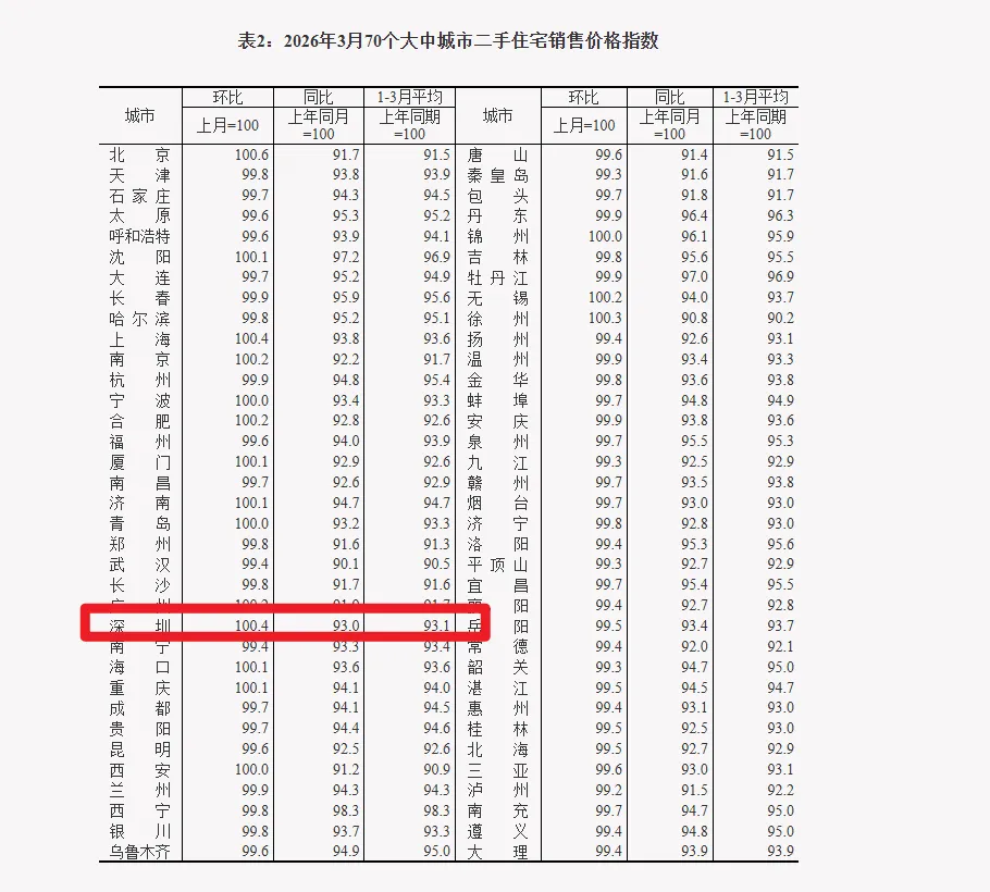 国家统计局2026年3月份70个大中城市商品住宅销售价格变动情况,深圳新房二手房齐上涨:
