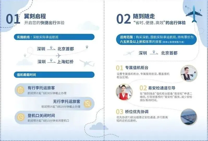 据了解,“翼刻启程”首期覆盖深圳—北京首都、深圳—上海虹桥两条黄金航线,核心服务规则主要围绕值机和登机时间做了优化。
