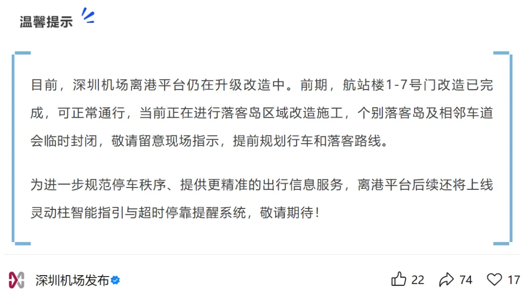目前,深圳机场离港平台仍在升级改造中。前期,航站楼1~7号门改造已完成,可正常通行,当前正在进行落客岛区域改造施工,个别落客岛及相邻车道会临时封闭,敬请留意现场指示,提前规划行车和落客路线。