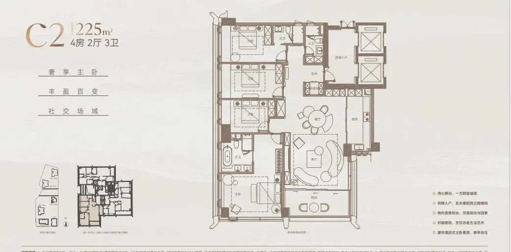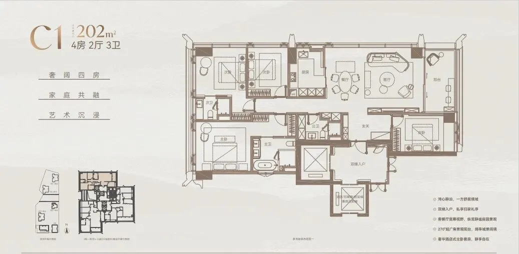 户型面积起步户型为四房三卫及以上,主力户型面积段为209-1150平方米,涵盖低区、高区、超高区及顶楼大平层。