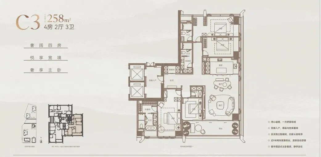 主力户型为四房及以上,包括202㎡、225㎡、258㎡、216㎡、287㎡、295㎡、305㎡、349㎡、409㎡、427㎡等,部分户型配备保姆房及家政动线。单价区间为15万-26万元/㎡,总价从3233万元起,最高达1.05亿元。