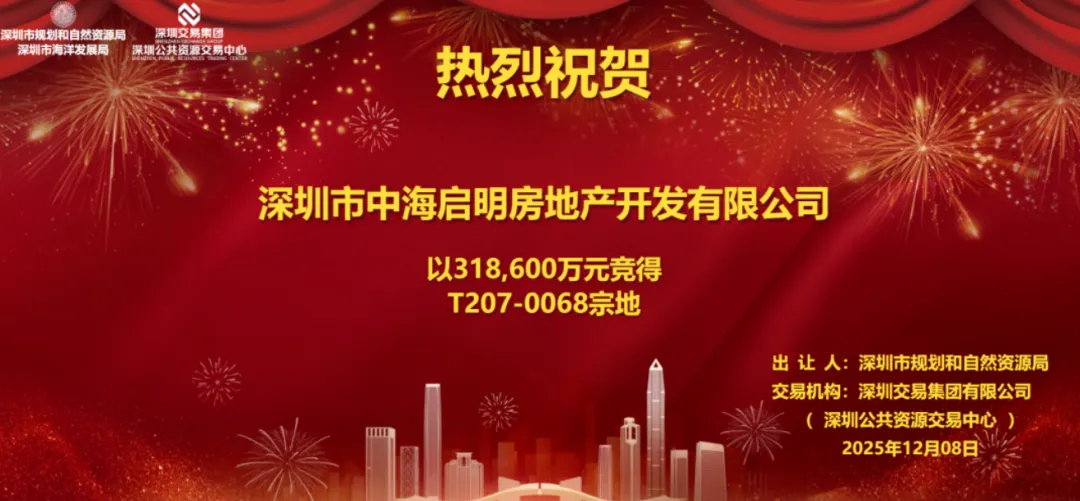 2025年12月8日,深超总T207-0068宗地出让,竞拍共吸引了6家房企参拍,包括华发、华润置地、保利发展、建发、中海地产和招商蛇口。历经多轮竞价厮杀,最终中海地产以31.86亿元竞得这宗地块,成交楼面价7.74万元/平方米,溢价率42.49%,创深圳超级总部宅地溢价新高。