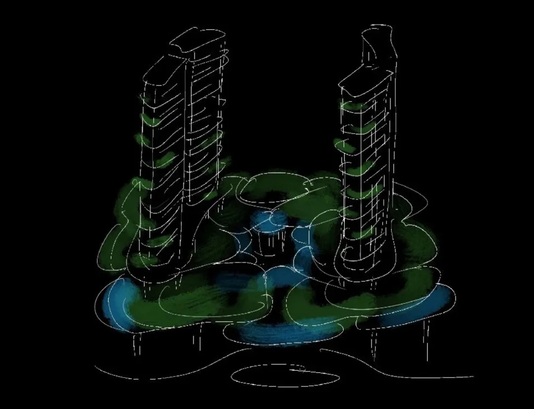 三层则是未来绿岛,在抬升层之上打造出私密的空中花园,南北两栋纯板楼采用最小化布局,同时适度扭转楼栋角度,既最大化利用了内部花园景观,又有效避开了外部视线干扰,隔绝了城市喧嚣,形成了一座悬浮于城市之上的私享秘境,让业主能够在高密度的城市中拥有一片静谧的居住天地。