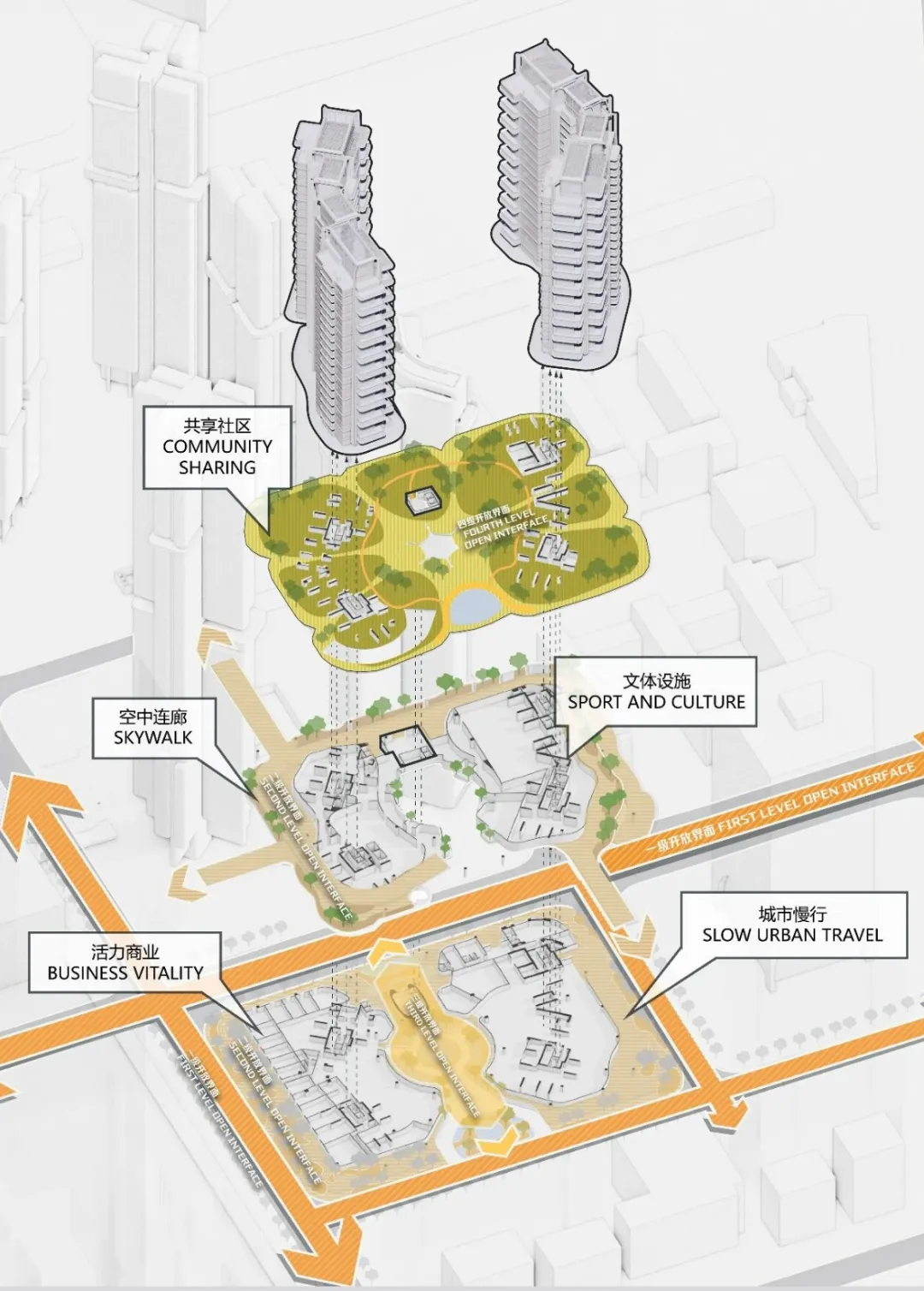其中,外C区域面向城市开放,沿文体场馆外围设置了环形公共连廊,在街角位置适当退让,打造出生态景观节点,不仅激活了片区的公共活力,也为市民提供了可游可憩的公共空间;